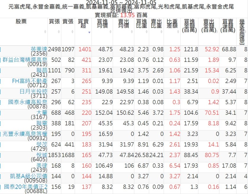 2024-1105主力買賣超個股 2024-11-05 股狗網小編 籌碼面每日資訊 發表留言 可參考下文 『如何查詢當沖、隔日沖分公司券商買賣』 主力當沖券商: 『元富虎尾』,『永豐金嘉義』,『統一嘉義』,『凱基嘉義』,『富邦嘉義』,『富邦虎尾』,『光和虎尾』,『凱基虎尾』,『永豐金虎尾』。 『當沖標的』 『買超股票』 『賣超股票』 免責宣言 本網站文章所提供資訊僅供參考,並無任何推介買賣之意,投資人應自行承擔交易風險。 分享此文: 按一下即可分享至 X(在新視窗中開啟) X 按一下以分享至 Facebook(在新視窗中開啟) Facebook 喜歡 正在載入...