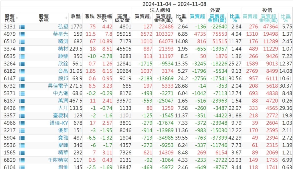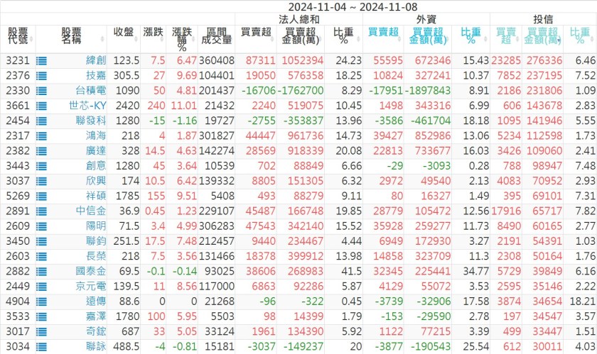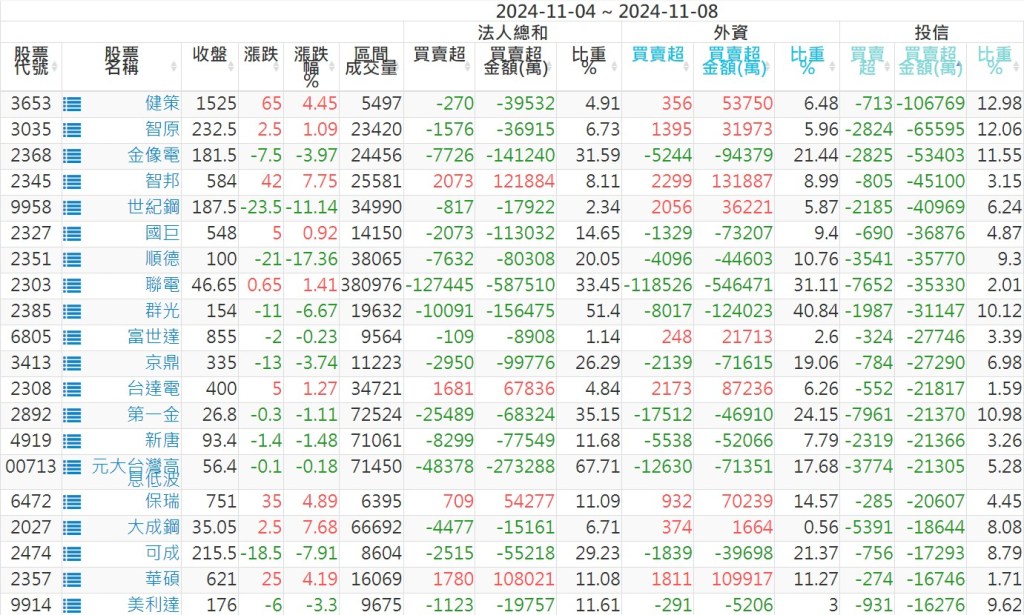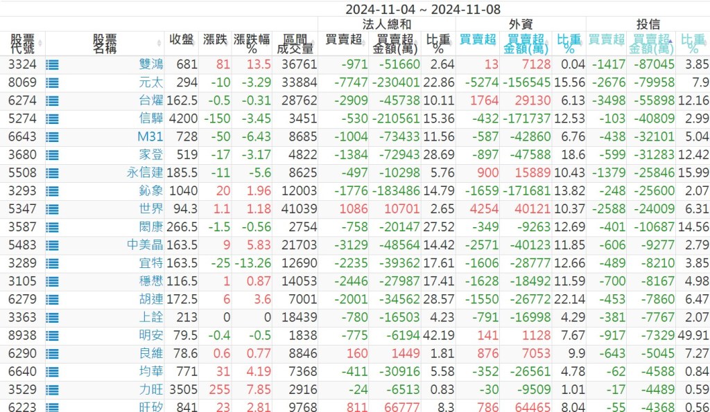 2024/11/04~2024/11/08近5日【投信】買賣超個股 2024-11-10 股狗網小編 投資誌-大盤 發表留言 【上市投信買超個股】(以金額排行,單位:萬) 【上市投信賣超個股】(以金額排行,單位:萬) 【上櫃投信買超個股】(以金額排行,單位:萬) 【上櫃投信賣超個股】(以金額排行,單位:萬) 免責宣言 本網站文章所提供資訊僅供參考,並無任何推介買賣之意,投資人應自行承擔交易風險。 分享此文: 分享到 X(在新視窗中開啟) X 分享到 Facebook(在新視窗中開啟) Facebook 喜歡 正在載入...