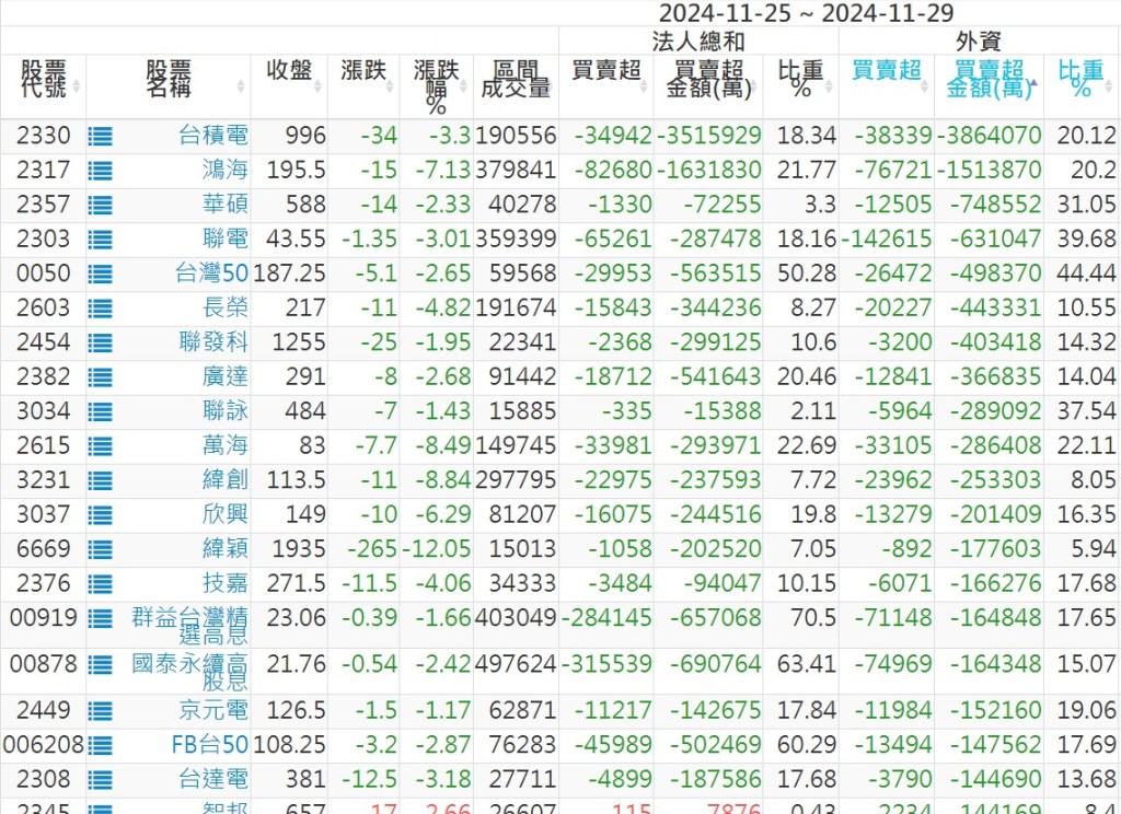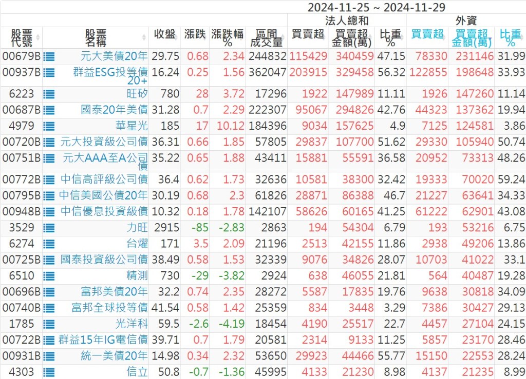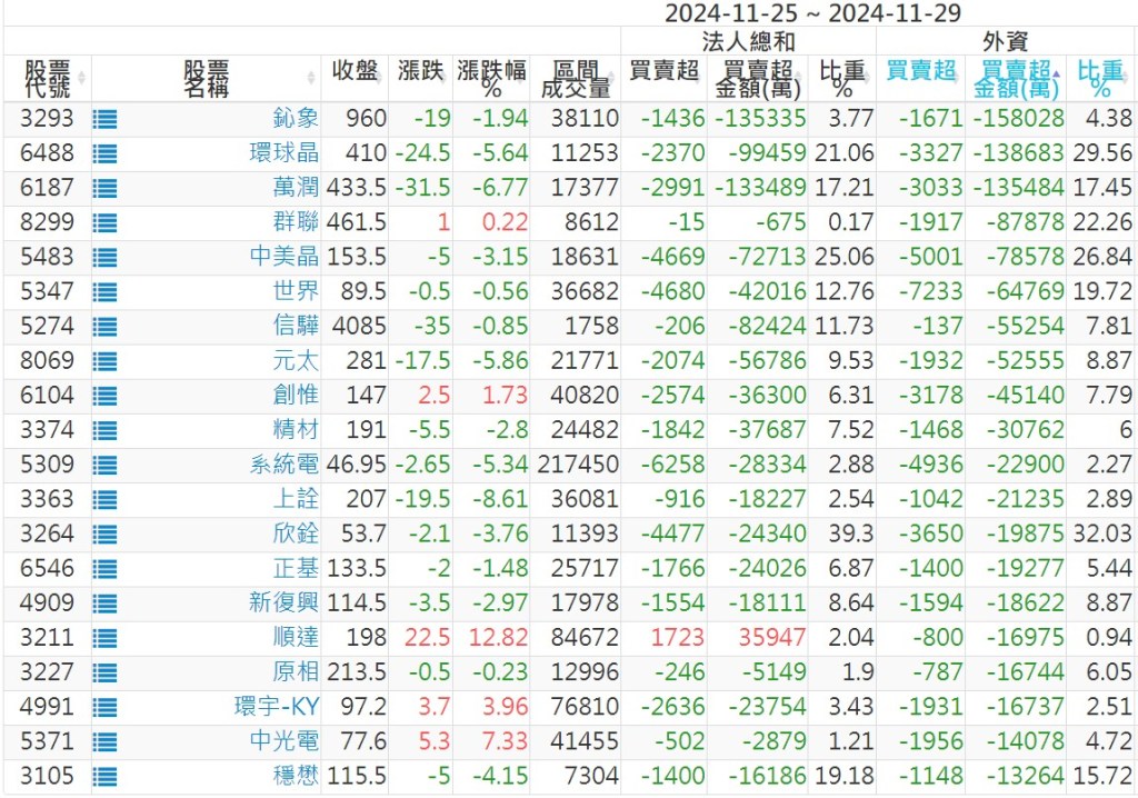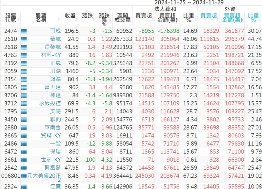 2024/11/25~2024/11/29近5日【外資】買賣超個股 2024-12-01 股狗網小編 投資誌-大盤 發表留言 外資本周累積【賣超】約1014億元。 【上市外資買超個股】(以金額排行,單位:萬) 【上市外資賣超個股】(以金額排行,單位:萬) 【上櫃外資買超個股】(以金額排行,單位:萬) 【上櫃外資賣超個股】(以金額排行,單位:萬) 免責宣言 本網站文章所提供資訊僅供參考,並無任何推介買賣之意,投資人應自行承擔交易風險。 分享此文: 分享到 X(在新視窗中開啟) X 分享到 Facebook(在新視窗中開啟) Facebook 喜歡 正在載入...