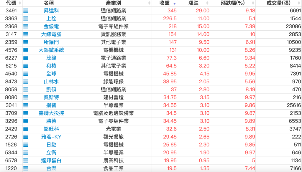 2024-1211日新高爆量上漲股 2024-12-11 股狗網小編 選股條件 發表留言 利用股狗選股的選股條件可以【挑選突破20日新高,爆量上漲起漲點股票】 1.股狗選股 https://www.stockdog.com.tw 2.選股條件: a.收盤價創20日新高 b.當日漲幅 > 2% C.成交量大於5日均量2倍 免責宣言 本網站文章所提供資訊僅供參考,並無任何推介買賣之意,投資人應自行承擔交易風險。 分享此文: 按一下即可分享至 X(在新視窗中開啟) X 按一下以分享至 Facebook(在新視窗中開啟) Facebook 喜歡 正在載入...