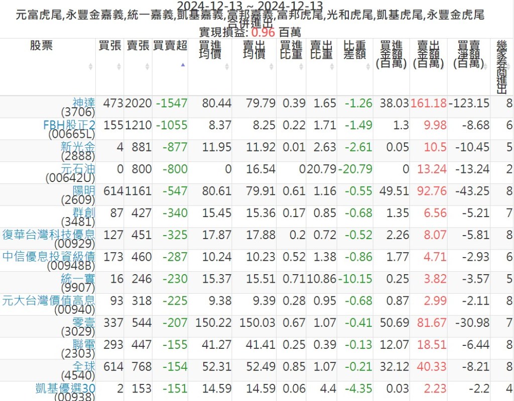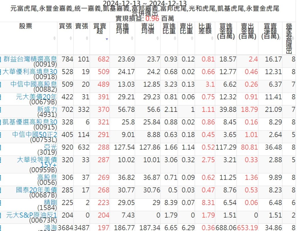 2024-1213主力買賣超個股 2024-12-14 股狗網小編 籌碼面每日資訊 發表留言 可參考下文 『如何查詢當沖、隔日沖分公司券商買賣』 主力當沖券商: 『元富虎尾』,『永豐金嘉義』,『統一嘉義』,『凱基嘉義』,『富邦嘉義』,『富邦虎尾』,『光和虎尾』,『凱基虎尾』,『永豐金虎尾』。 『當沖標的』 『買超股票』 『賣超股票』 免責宣言 本網站文章所提供資訊僅供參考,並無任何推介買賣之意,投資人應自行承擔交易風險。 分享此文: 按一下即可分享至 X(在新視窗中開啟) X 按一下以分享至 Facebook(在新視窗中開啟) Facebook 喜歡 正在載入...