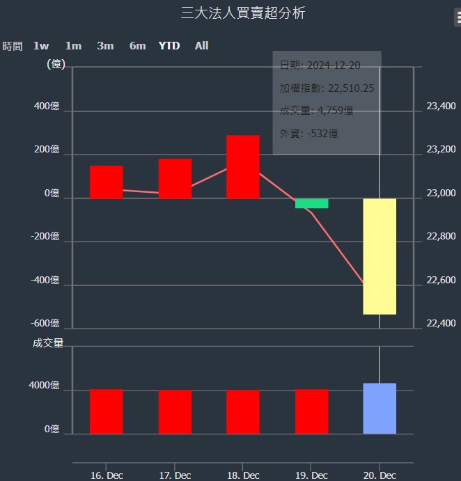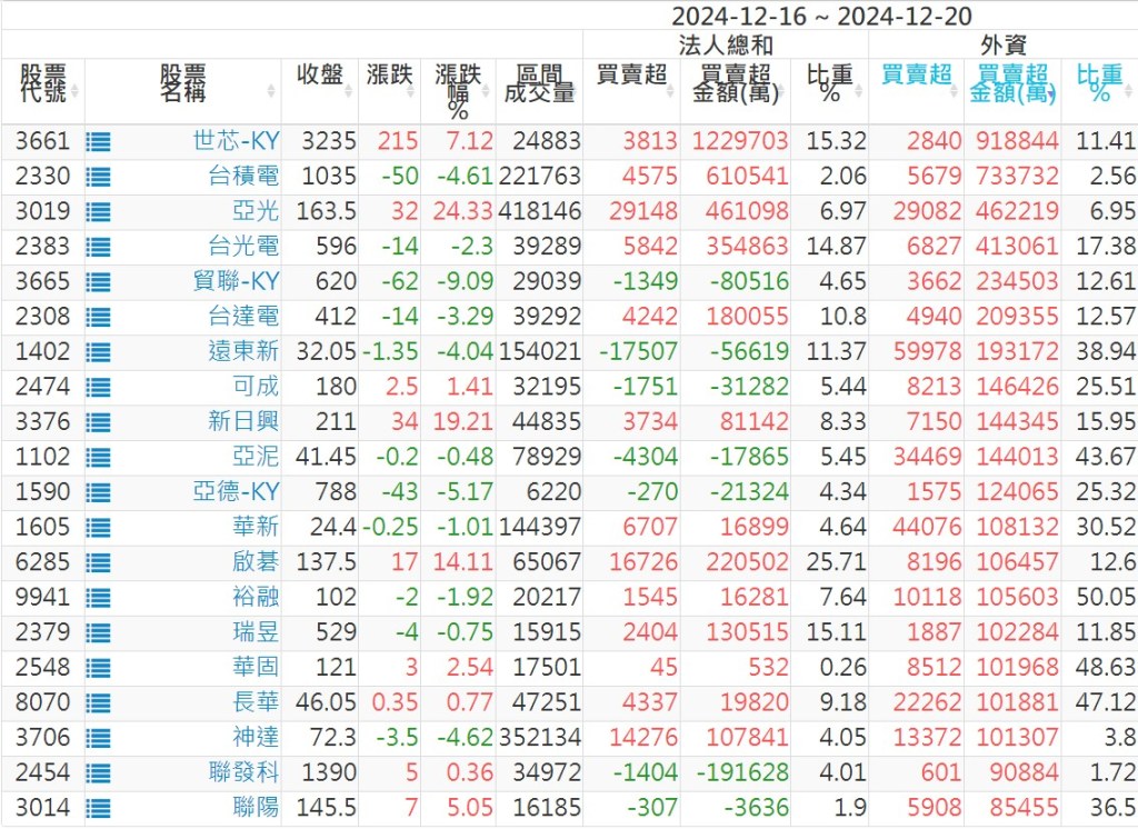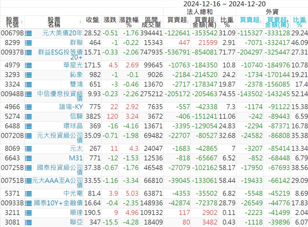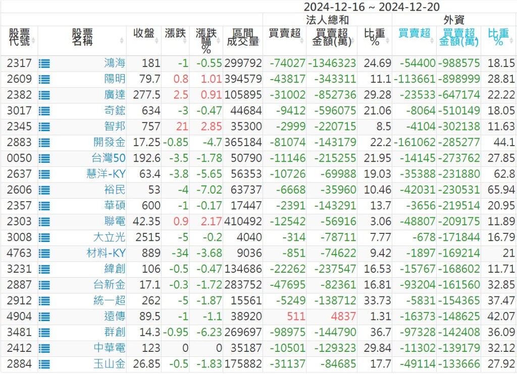 2024/12/16~2024/12/20近5日【外資】買賣超個股 2024-12-22 股狗網小編 投資誌-大盤 發表留言 外資本周累積【賣超】約261億元。 【上市外資買超個股】(以金額排行,單位:萬) 【上市外資賣超個股】(以金額排行,單位:萬) 【上櫃外資買超個股】(以金額排行,單位:萬) 【上櫃外資賣超個股】(以金額排行,單位:萬) 免責宣言 本網站文章所提供資訊僅供參考,並無任何推介買賣之意,投資人應自行承擔交易風險。 分享此文: 按一下即可分享至 X(在新視窗中開啟) X 按一下以分享至 Facebook(在新視窗中開啟) Facebook 喜歡 正在載入...