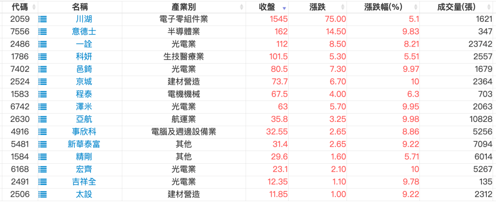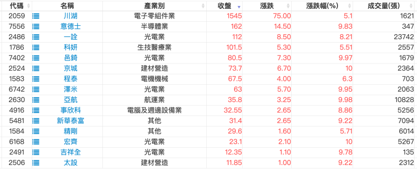 2024-1230日新高爆量上漲股 2024-12-30 股狗網小編 選股條件 發表留言 利用股狗選股的選股條件可以【挑選突破20日新高,爆量上漲起漲點股票】 1.股狗選股 https://www.stockdog.com.tw 2.選股條件: a.收盤價創20日新高 b.當日漲幅 > 2% C.成交量大於5日均量2倍 免責宣言 本網站文章所提供資訊僅供參考,並無任何推介買賣之意,投資人應自行承擔交易風險。 分享此文: 分享到 X(在新視窗中開啟) X 分享到 Facebook(在新視窗中開啟) Facebook 喜歡 正在載入...