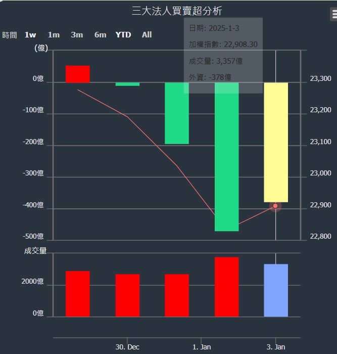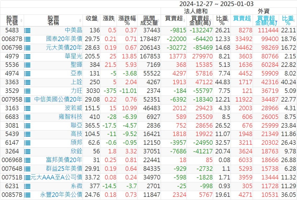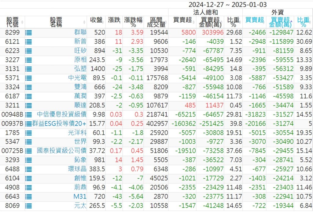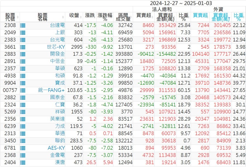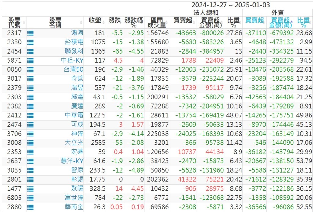 2024/12/27~2025/01/03近5日【外資】買賣超個股 2025-01-05 股狗網小編 投資誌-大盤 發表留言 外資本周累積【賣超】約378億元。 【上市外資買超個股】(以金額排行,單位:萬) 【上市外資賣超個股】(以金額排行,單位:萬) 【上櫃外資買超個股】(以金額排行,單位:萬) 【上櫃外資賣超個股】(以金額排行,單位:萬) 免責宣言 本網站文章所提供資訊僅供參考,並無任何推介買賣之意,投資人應自行承擔交易風險。 分享此文: 分享到 X(在新視窗中開啟) X 分享到 Facebook(在新視窗中開啟) Facebook 喜歡 正在載入...