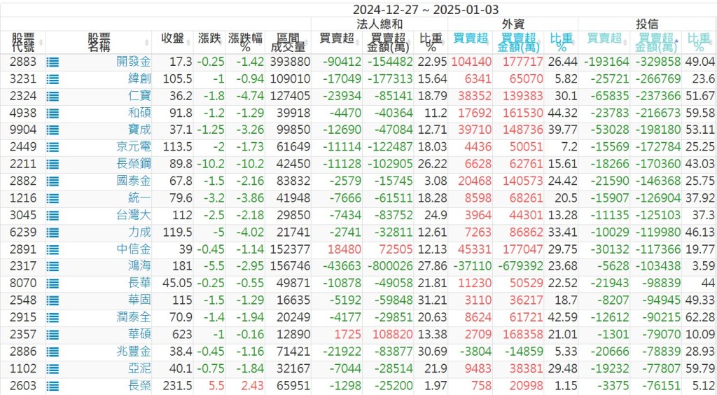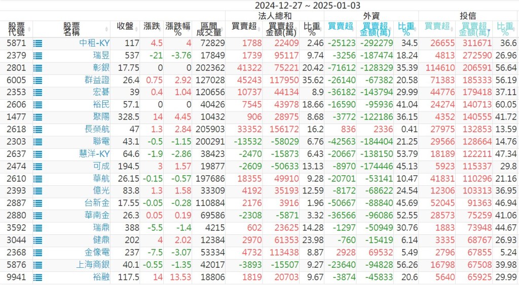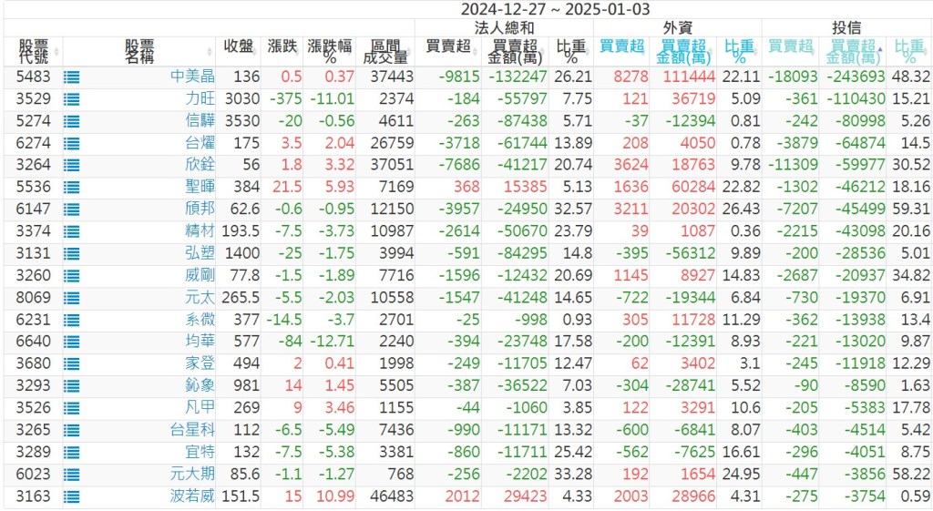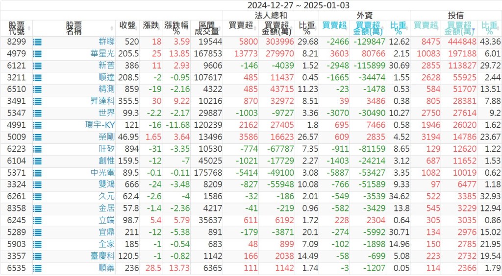 2024/12/27~2025/01/03近5日【投信】買賣超個股 2025-01-05 股狗網小編 投資誌-大盤 發表留言 【上市投信買超個股】(以金額排行,單位:萬) 【上市投信賣超個股】(以金額排行,單位:萬) 【上櫃投信買超個股】(以金額排行,單位:萬) 【上櫃投信賣超個股】(以金額排行,單位:萬) 免責宣言 本網站文章所提供資訊僅供參考,並無任何推介買賣之意,投資人應自行承擔交易風險。 分享此文: 按一下即可分享至 X(在新視窗中開啟) X 按一下以分享至 Facebook(在新視窗中開啟) Facebook 喜歡 正在載入...