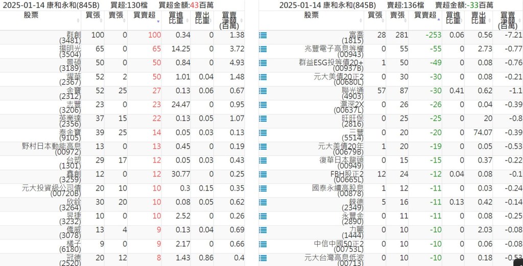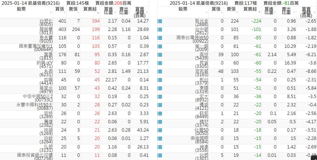 2025-0114關鍵券商買賣超 2025-01-14 股狗網小編 籌碼面每日資訊 發表留言 關鍵券商買賣超: 臺銀證券(1040): 台灣摩根士丹利(1470): 凱基台北(9268): 凱基信義(9216): 元大土城永寧(9875): 康和永和(845B) : 富邦建國(9658): 免責宣言 本網站文章所提供資訊僅供參考,並無任何推介買賣之意,投資人應自行承擔交易風險。 分享此文: 按一下即可分享至 X(在新視窗中開啟) X 按一下以分享至 Facebook(在新視窗中開啟) Facebook 喜歡 正在載入...