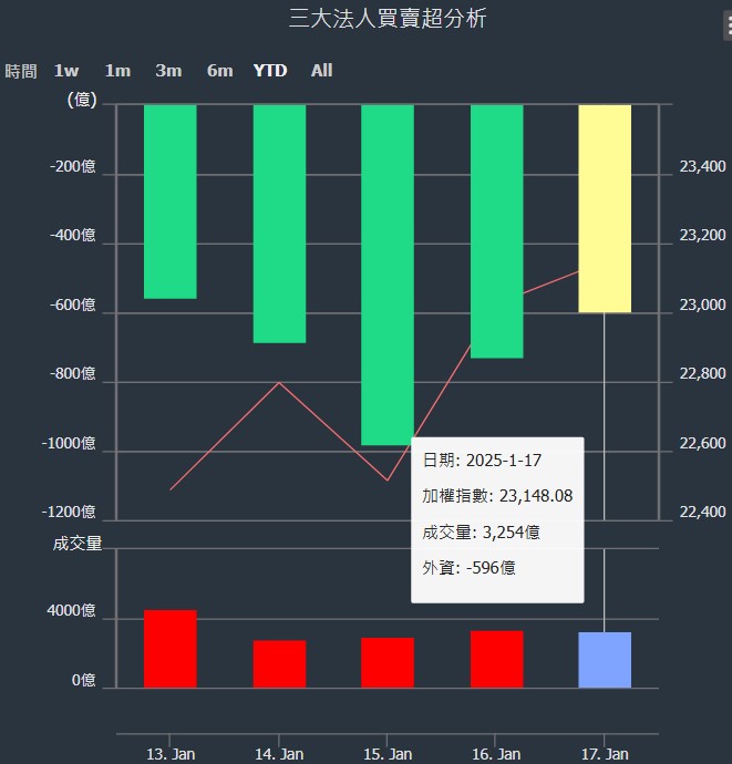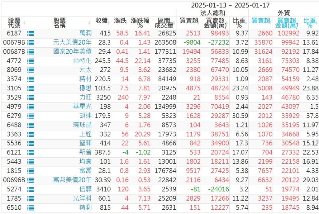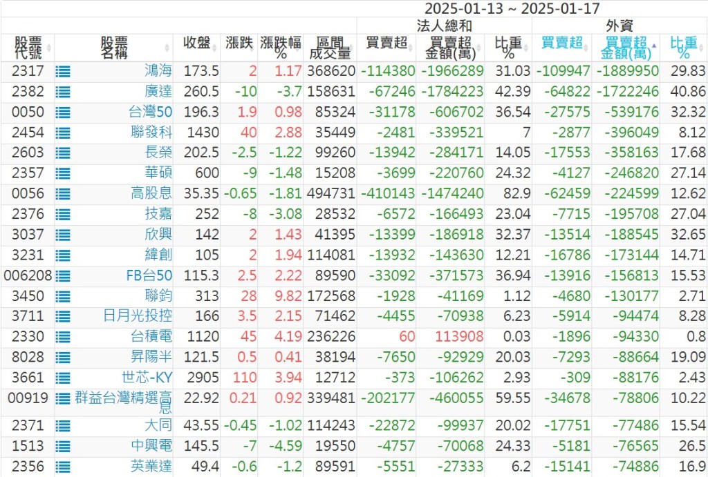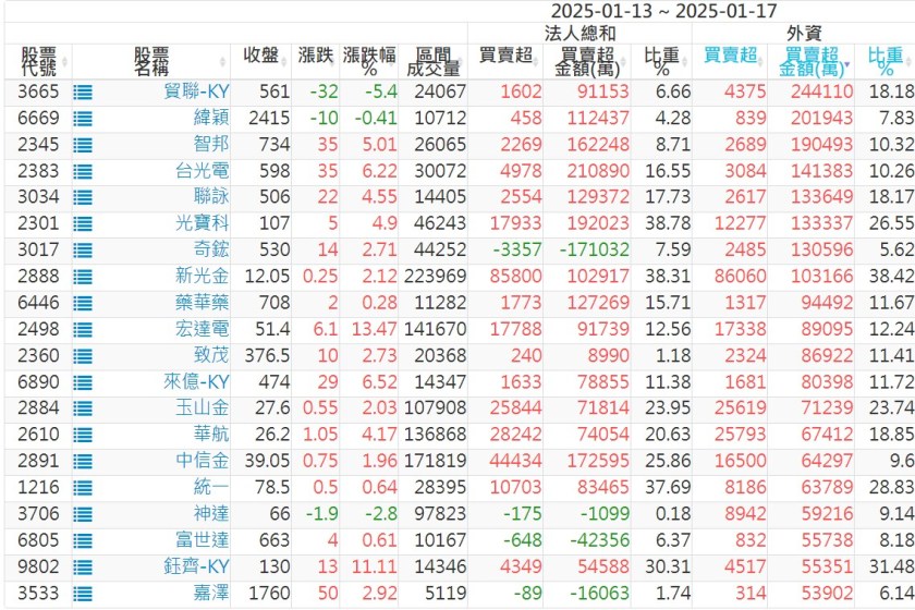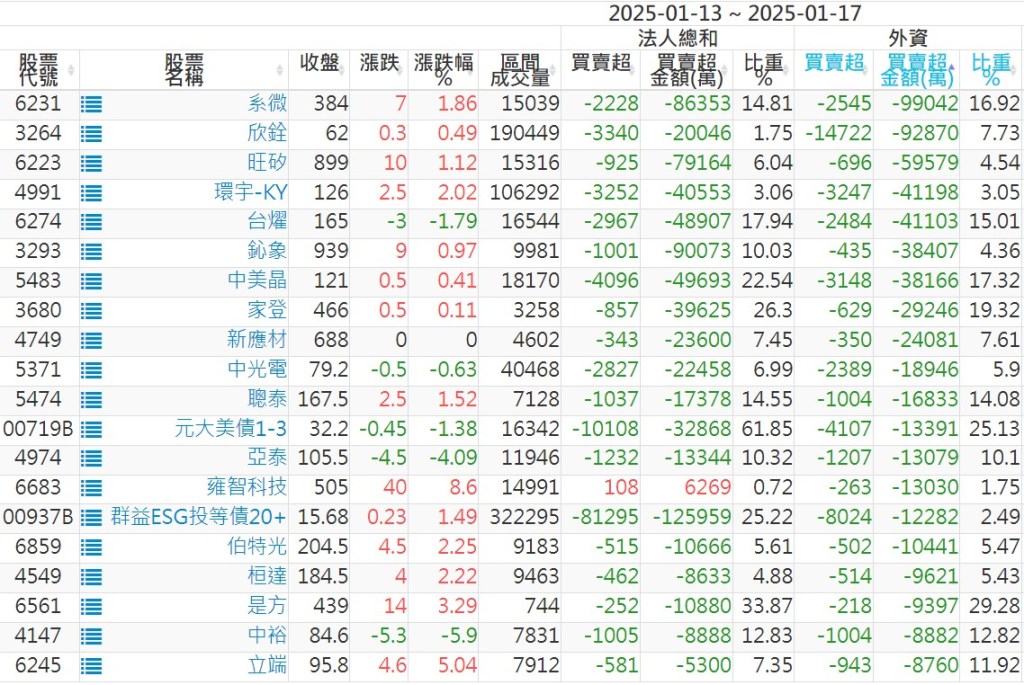 2025/01/13~2025/01/17近5日【外資】買賣超個股 2025-01-19 股狗網小編 投資誌-大盤 發表留言 外資本周累積【賣超】約596億元。 【上市外資買超個股】(以金額排行,單位:萬) 【上市外資賣超個股】(以金額排行,單位:萬) 【上櫃外資買超個股】(以金額排行,單位:萬) 【上櫃外資賣超個股】(以金額排行,單位:萬) 免責宣言 本網站文章所提供資訊僅供參考,並無任何推介買賣之意,投資人應自行承擔交易風險。 分享此文: 按一下即可分享至 X(在新視窗中開啟) X 按一下以分享至 Facebook(在新視窗中開啟) Facebook 喜歡 正在載入...