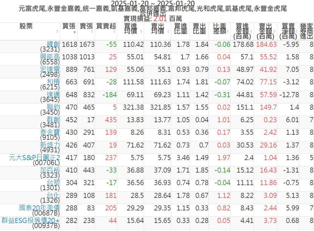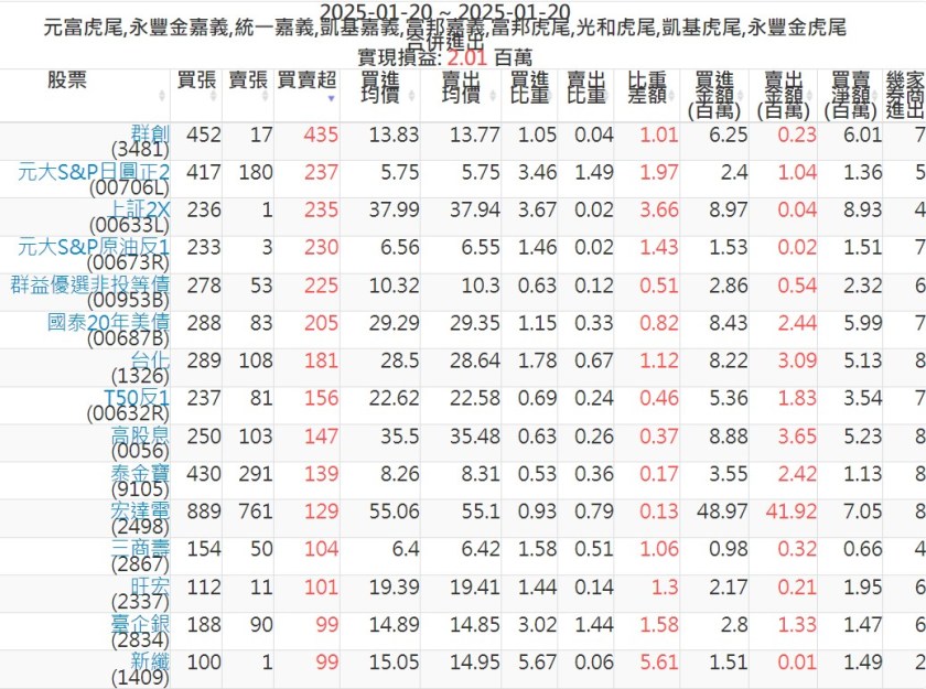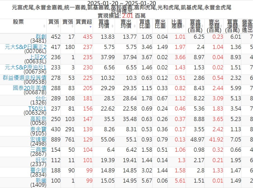 2025-0120主力買賣超個股 2025-01-20 股狗網小編 籌碼面每日資訊 發表留言 可參考下文 『如何查詢當沖、隔日沖分公司券商買賣』 主力當沖券商: 『元富虎尾』,『永豐金嘉義』,『統一嘉義』,『凱基嘉義』,『富邦嘉義』,『富邦虎尾』,『光和虎尾』,『凱基虎尾』,『永豐金虎尾』。 『當沖標的』 『買超股票』 『賣超股票』 免責宣言 本網站文章所提供資訊僅供參考,並無任何推介買賣之意,投資人應自行承擔交易風險。 分享此文: 按一下即可分享至 X(在新視窗中開啟) X 按一下以分享至 Facebook(在新視窗中開啟) Facebook 喜歡 正在載入...