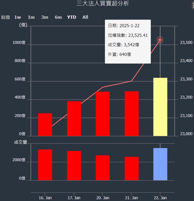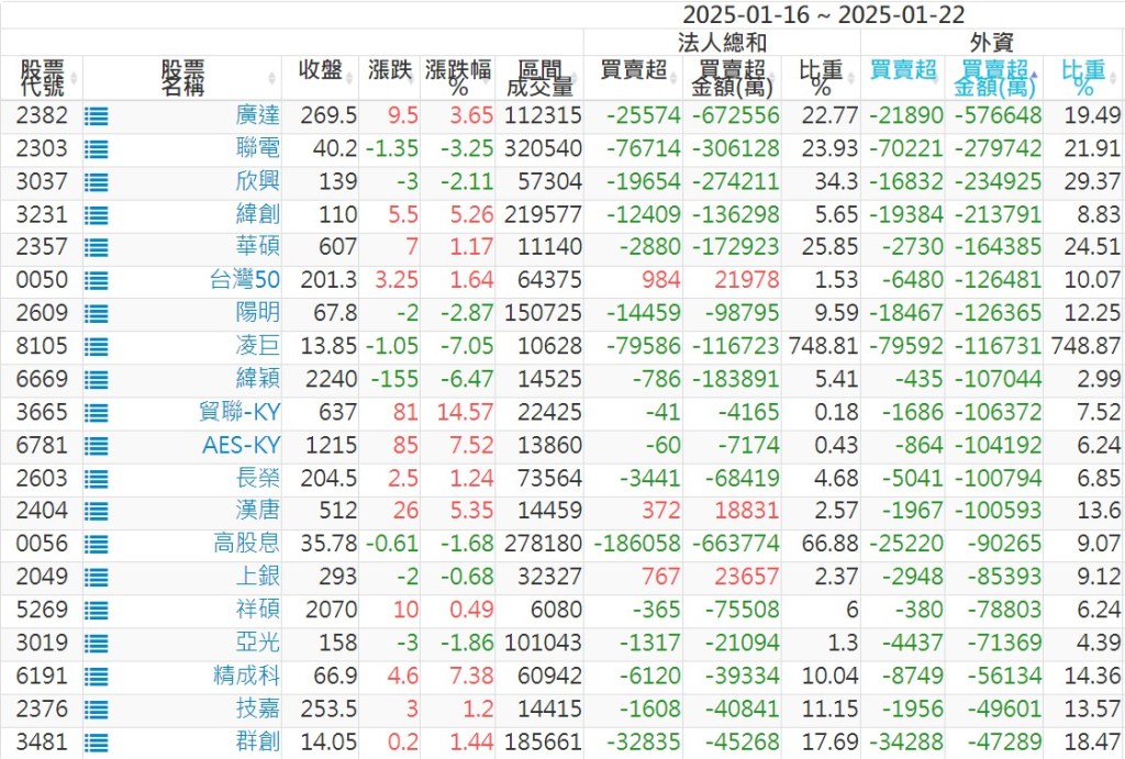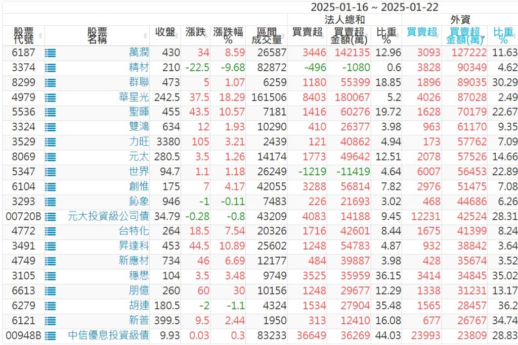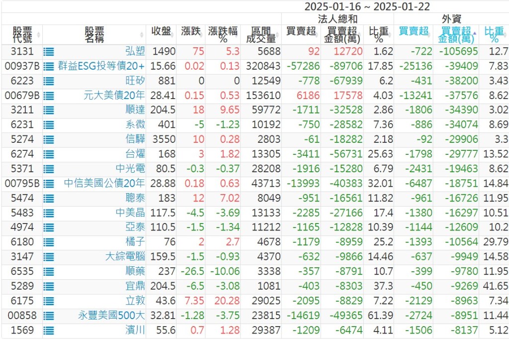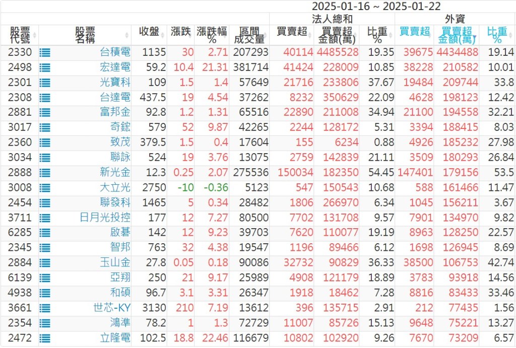 2025/01/16~2025/01/22近5日【外資】買賣超個股 2025-02-02 股狗網小編 投資誌-大盤 發表留言 外資本周累積【買超】約640億元。 【上市外資買超個股】(以金額排行,單位:萬) 【上市外資賣超個股】(以金額排行,單位:萬) 【上櫃外資買超個股】(以金額排行,單位:萬) 【上櫃外資賣超個股】(以金額排行,單位:萬) 免責宣言 本網站文章所提供資訊僅供參考,並無任何推介買賣之意,投資人應自行承擔交易風險。 分享此文: 按一下即可分享至 X(在新視窗中開啟) X 按一下以分享至 Facebook(在新視窗中開啟) Facebook 喜歡 正在載入...