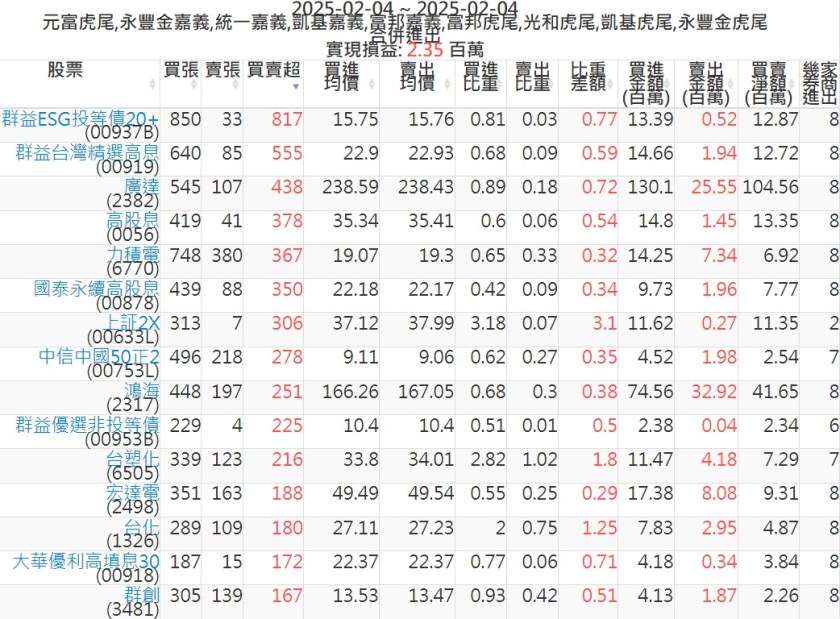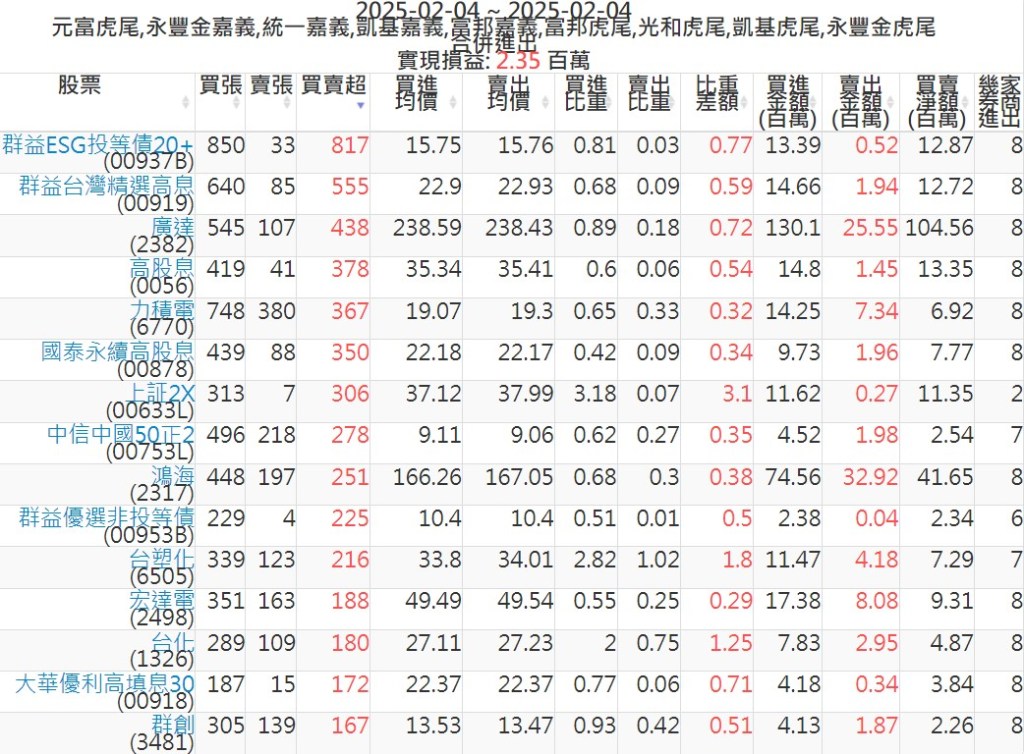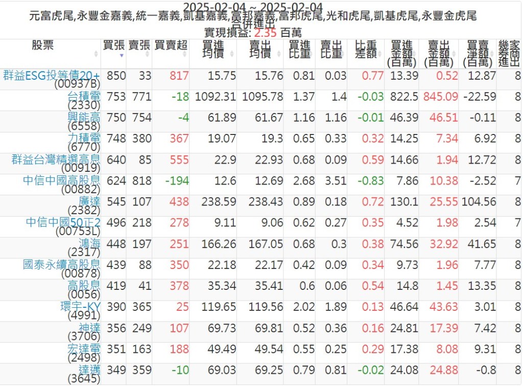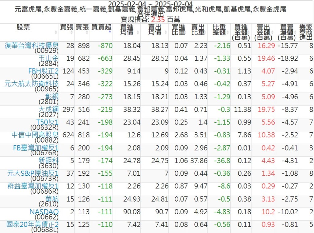 2025-0204主力買賣超個股 2025-02-04 股狗網小編 籌碼面每日資訊 發表留言 可參考下文 『如何查詢當沖、隔日沖分公司券商買賣』 主力當沖券商: 『元富虎尾』,『永豐金嘉義』,『統一嘉義』,『凱基嘉義』,『富邦嘉義』,『富邦虎尾』,『光和虎尾』,『凱基虎尾』,『永豐金虎尾』。 『當沖標的』 『買超股票』 『賣超股票』 免責宣言 本網站文章所提供資訊僅供參考,並無任何推介買賣之意,投資人應自行承擔交易風險。 分享此文: 按一下即可分享至 X(在新視窗中開啟) X 按一下以分享至 Facebook(在新視窗中開啟) Facebook 喜歡 正在載入...