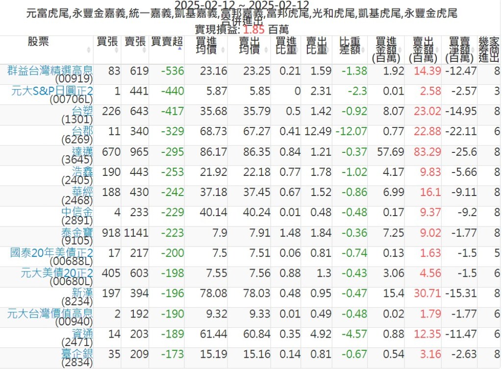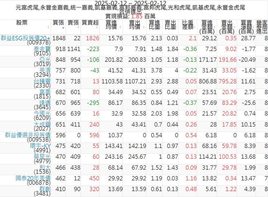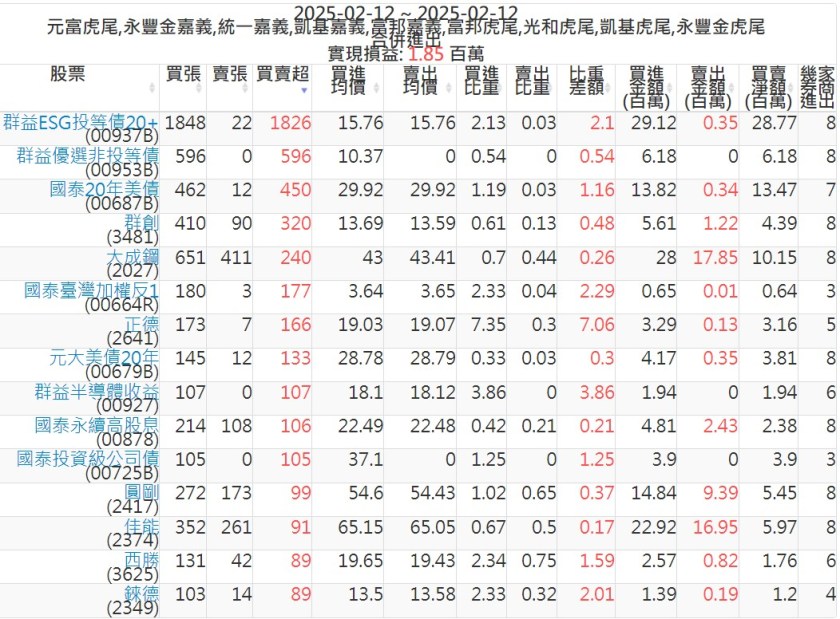 2025-0212主力買賣超個股 2025-02-12 股狗網小編 籌碼面每日資訊 發表留言 可參考下文 『如何查詢當沖、隔日沖分公司券商買賣』 主力當沖券商: 『元富虎尾』,『永豐金嘉義』,『統一嘉義』,『凱基嘉義』,『富邦嘉義』,『富邦虎尾』,『光和虎尾』,『凱基虎尾』,『永豐金虎尾』。 『當沖標的』 『買超股票』 『賣超股票』 免責宣言 本網站文章所提供資訊僅供參考,並無任何推介買賣之意,投資人應自行承擔交易風險。 分享此文: 按一下即可分享至 X(在新視窗中開啟) X 按一下以分享至 Facebook(在新視窗中開啟) Facebook 喜歡 正在載入...