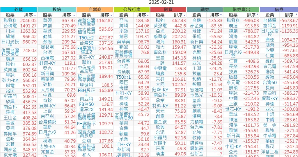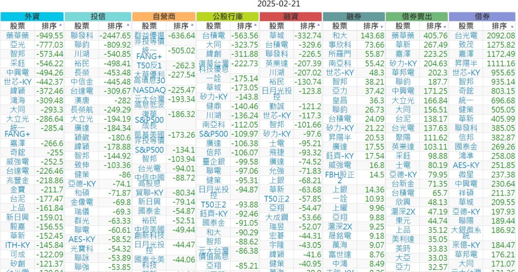 2025-0221【外資、投信】買賣超個股 2025-02-21 股狗網小編 投資誌-大盤 發表留言 上市:【外資、投信】買超(依金額) (單位:百萬) 上市:【外資、投信】賣超(依金額) (單位:百萬) 上市:【外資、投信】買超(依張數) (單位:張數) 上市:【外資、投信】賣超(依張數) (單位:張數) 免責宣言 本網站文章所提供資訊僅供參考,並無任何推介買賣之意,投資人應自行承擔交易風險。 分享此文: 按一下即可分享至 X(在新視窗中開啟) X 按一下以分享至 Facebook(在新視窗中開啟) Facebook 喜歡 正在載入...