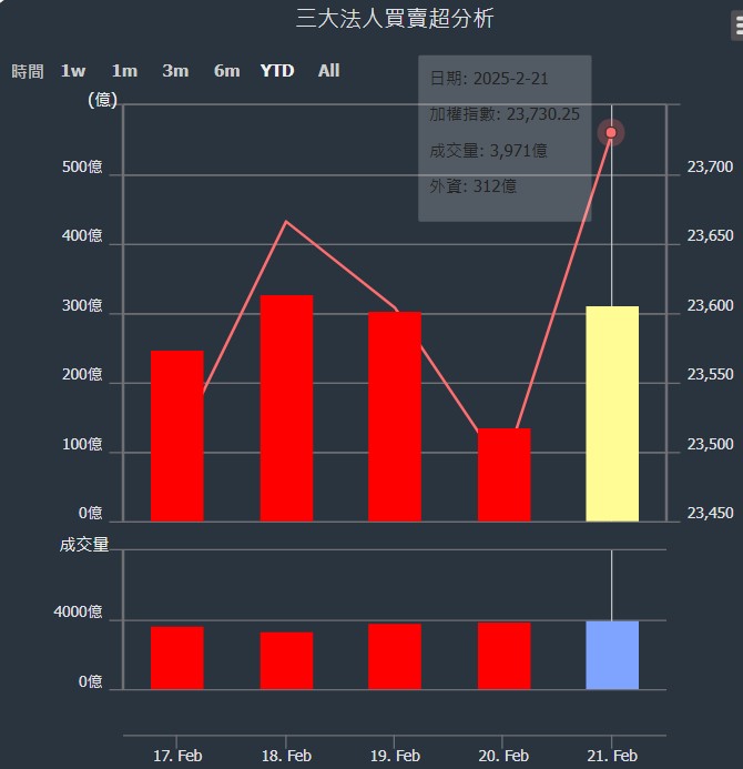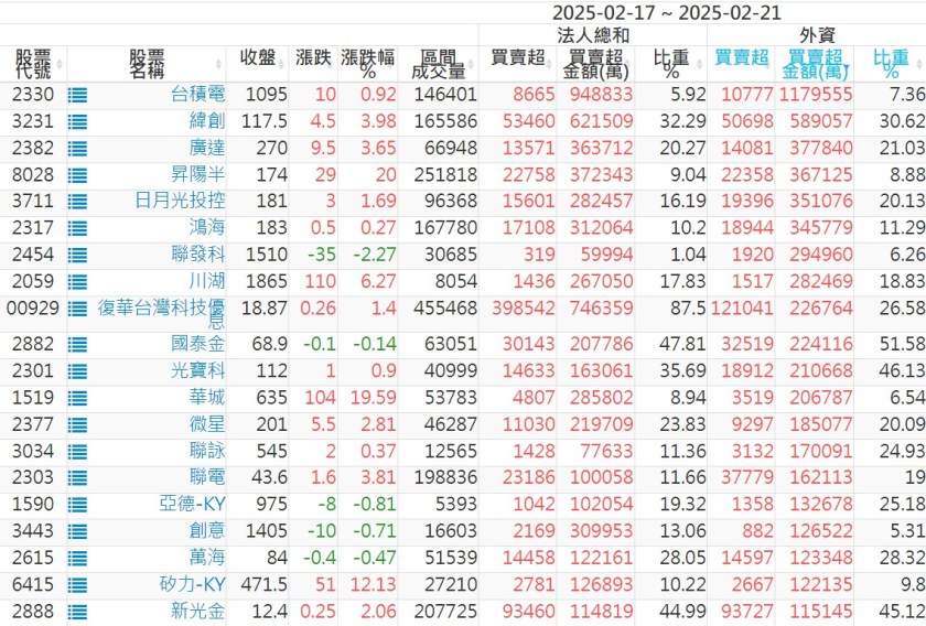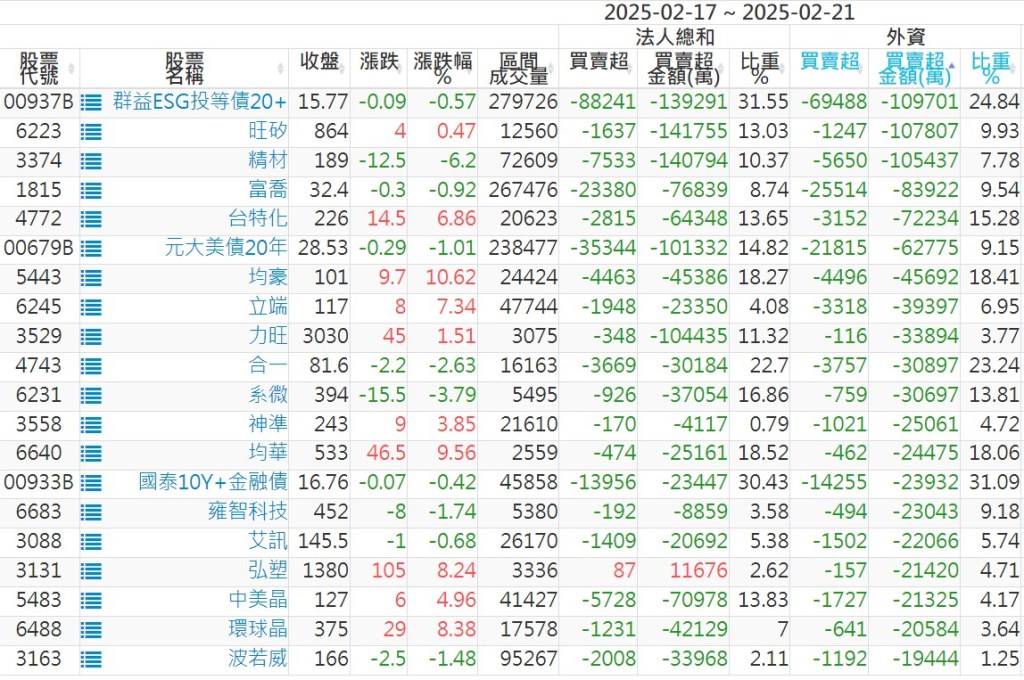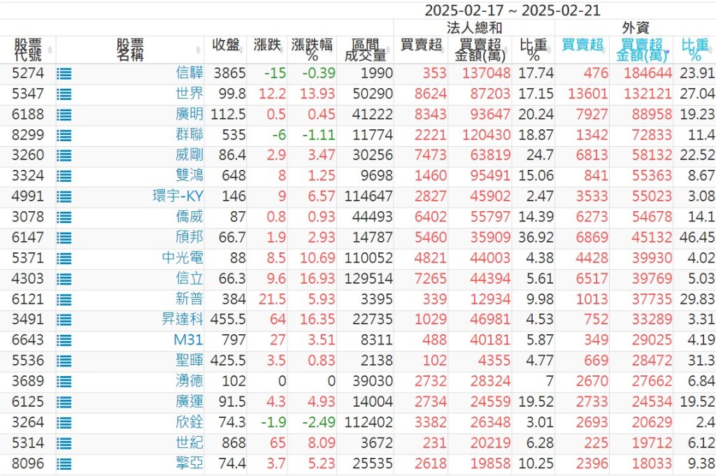 2025/02/17~2025/02/21近5日【外資】買賣超個股 2025-02-23 股狗網小編 投資誌-大盤 發表留言 外資本周累積【買超】約312億元。 【上市外資買超個股】(以金額排行,單位:萬) 【上市外資賣超個股】(以金額排行,單位:萬) 【上櫃外資買超個股】(以金額排行,單位:萬) 【上櫃外資賣超個股】(以金額排行,單位:萬) 免責宣言 本網站文章所提供資訊僅供參考,並無任何推介買賣之意,投資人應自行承擔交易風險。 分享此文: 按一下即可分享至 X(在新視窗中開啟) X 按一下以分享至 Facebook(在新視窗中開啟) Facebook 喜歡 正在載入...