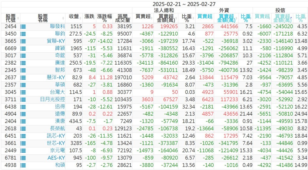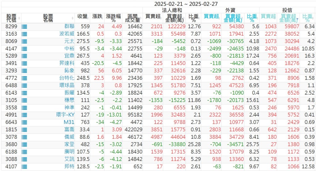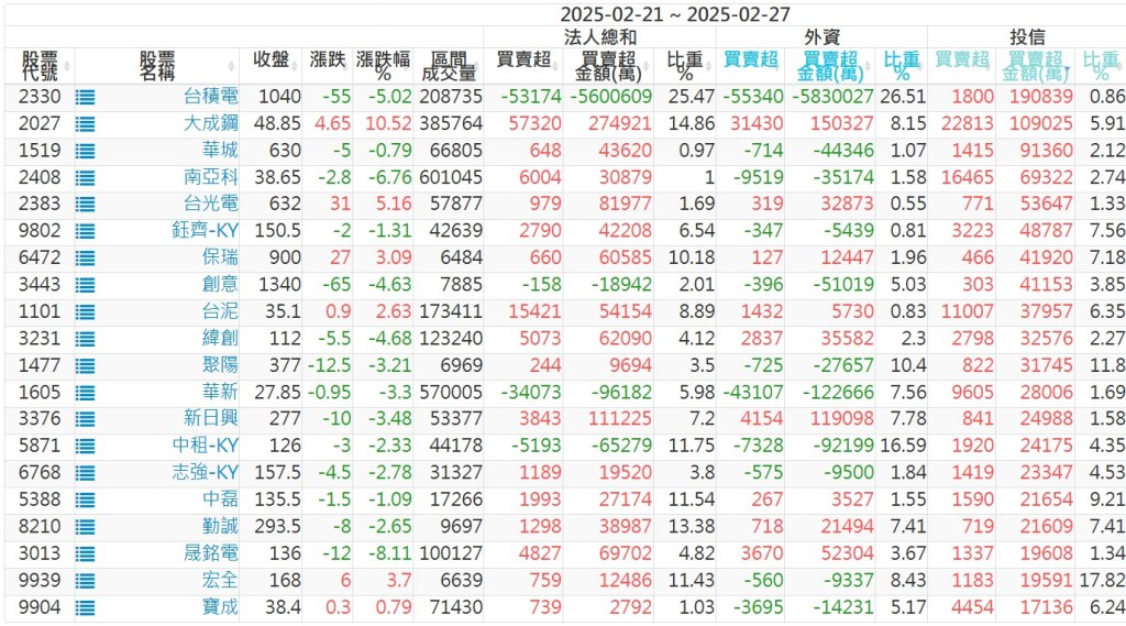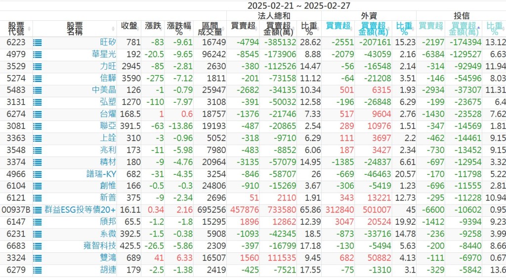 2025/02/21~2025/02/27近5日【投信】買賣超個股 2025-03-02 股狗網小編 投資誌-大盤 發表留言 【上市投信買超個股】(以金額排行,單位:萬) 【上市投信賣超個股】(以金額排行,單位:萬) 【上櫃投信買超個股】(以金額排行,單位:萬) 【上櫃投信賣超個股】(以金額排行,單位:萬) 免責宣言 本網站文章所提供資訊僅供參考,並無任何推介買賣之意,投資人應自行承擔交易風險。 分享此文: 按一下即可分享至 X(在新視窗中開啟) X 按一下以分享至 Facebook(在新視窗中開啟) Facebook 喜歡 正在載入...