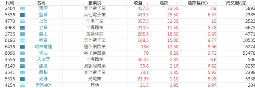 2025-0304日新高爆量上漲股 2025-03-04 股狗網小編 選股條件 發表留言 利用股狗選股的選股條件可以【挑選突破20日新高,爆量上漲起漲點股票】 1.股狗選股 https://www.stockdog.com.tw 2.選股條件: a.收盤價創20日新高 b.當日漲幅 > 2% C.成交量大於5日均量2倍 免責宣言 本網站文章所提供資訊僅供參考,並無任何推介買賣之意,投資人應自行承擔交易風險。 分享此文: 按一下即可分享至 X(在新視窗中開啟) X 按一下以分享至 Facebook(在新視窗中開啟) Facebook 喜歡 正在載入...