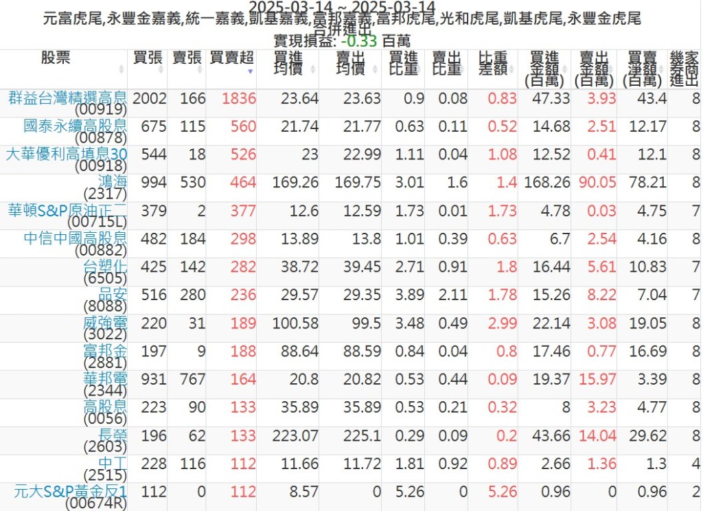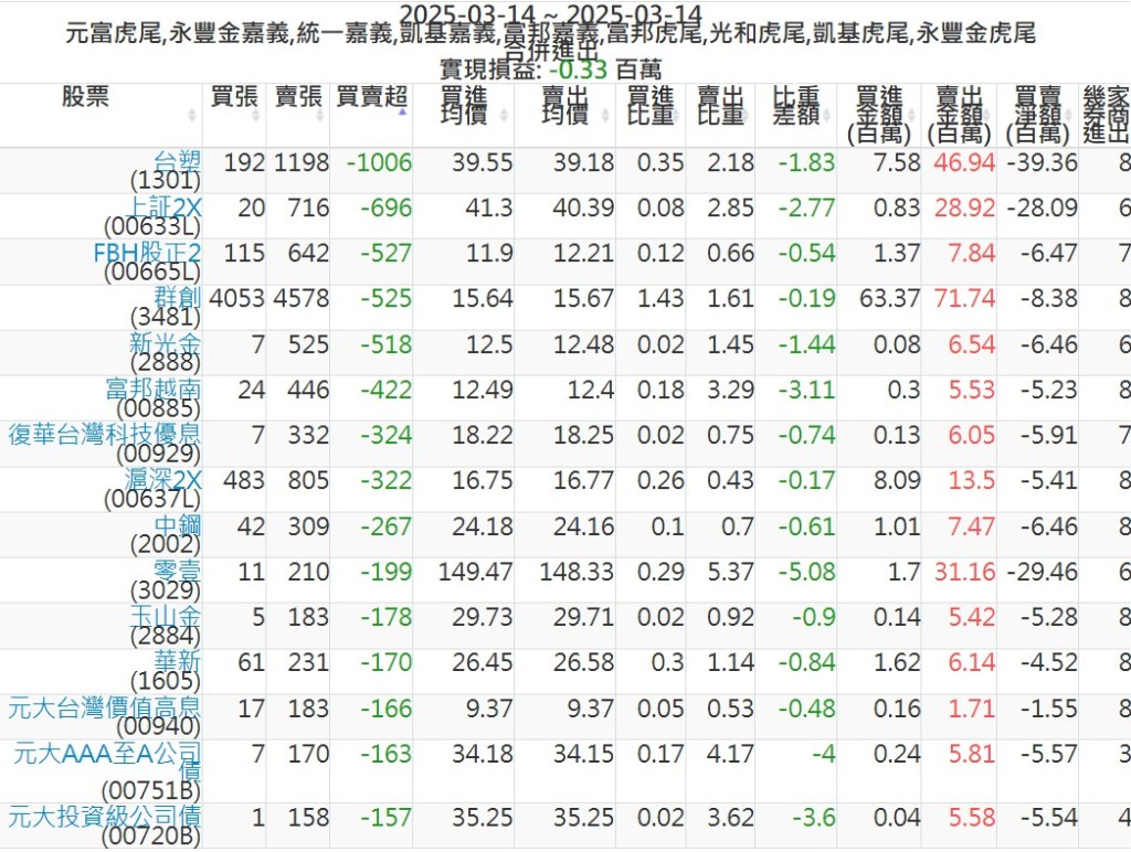 2025-0314主力買賣超個股 2025-03-14 股狗網小編 籌碼面每日資訊 發表留言 可參考下文 『如何查詢當沖、隔日沖分公司券商買賣』 主力當沖券商: 『元富虎尾』,『永豐金嘉義』,『統一嘉義』,『凱基嘉義』,『富邦嘉義』,『富邦虎尾』,『光和虎尾』,『凱基虎尾』,『永豐金虎尾』。 『當沖標的』 『買超股票』 『賣超股票』 免責宣言 本網站文章所提供資訊僅供參考,並無任何推介買賣之意,投資人應自行承擔交易風險。 分享此文: 按一下即可分享至 X(在新視窗中開啟) X 按一下以分享至 Facebook(在新視窗中開啟) Facebook 喜歡 正在載入...