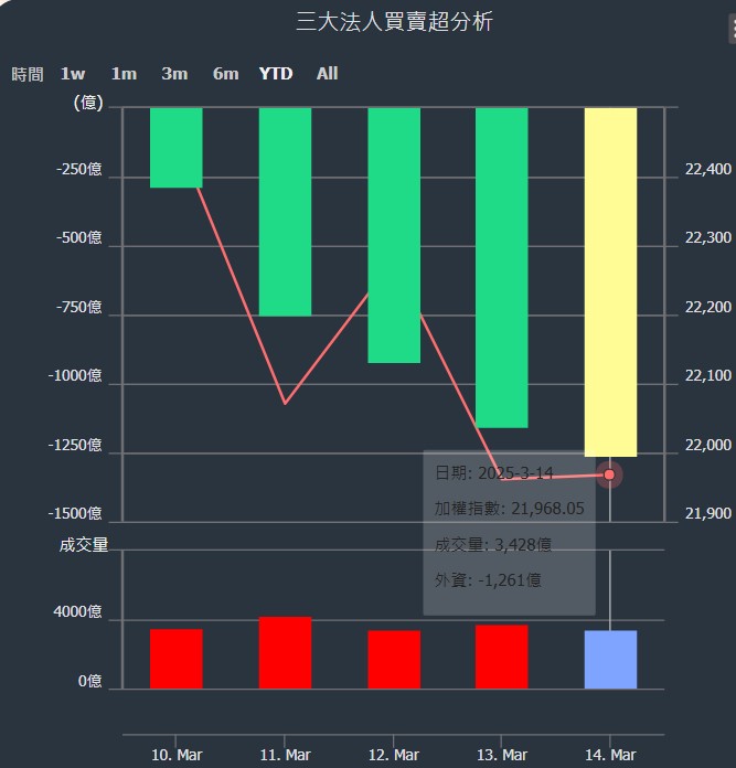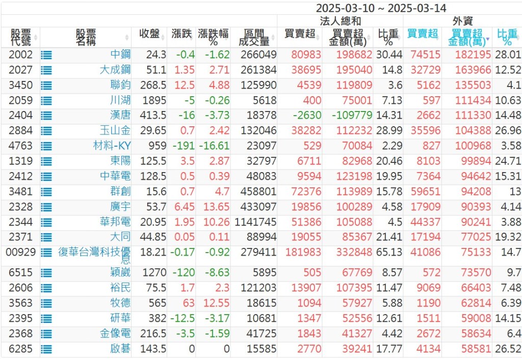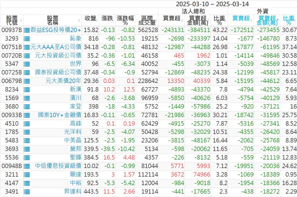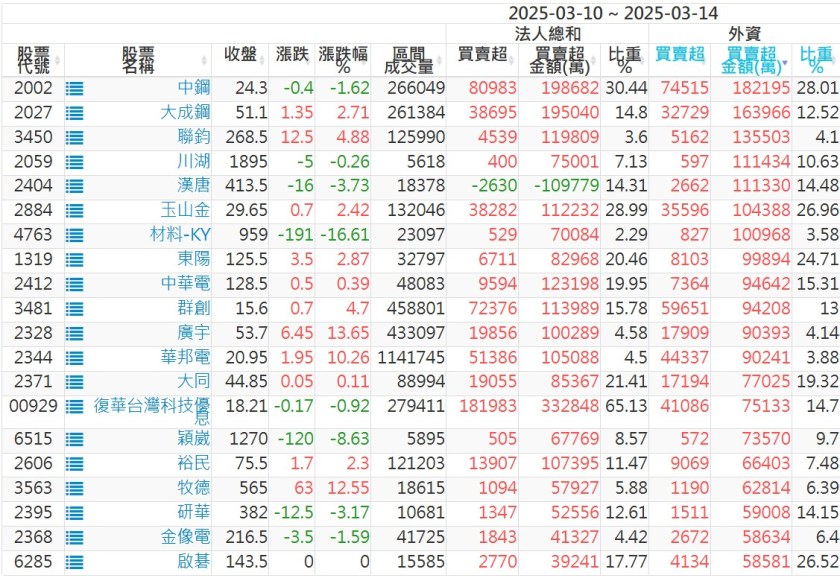 2025/03/10~2025/03/14近5日【外資】買賣超個股 2025-03-16 股狗網小編 投資誌-大盤 發表留言 外資本周累積【賣超】約1261億元。 【上市外資買超個股】(以金額排行,單位:萬) 【上市外資賣超個股】(以金額排行,單位:萬) 【上櫃外資買超個股】(以金額排行,單位:萬) 【上櫃外資賣超個股】(以金額排行,單位:萬) 免責宣言 本網站文章所提供資訊僅供參考,並無任何推介買賣之意,投資人應自行承擔交易風險。 分享此文: 按一下即可分享至 X(在新視窗中開啟) X 按一下以分享至 Facebook(在新視窗中開啟) Facebook 喜歡 正在載入...