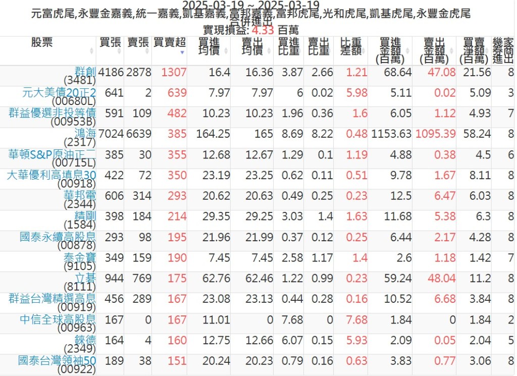 2025-0319主力買賣超個股 2025-03-19 股狗網小編 籌碼面每日資訊 發表留言 可參考下文 『如何查詢當沖、隔日沖分公司券商買賣』 主力當沖券商: 『元富虎尾』,『永豐金嘉義』,『統一嘉義』,『凱基嘉義』,『富邦嘉義』,『富邦虎尾』,『光和虎尾』,『凱基虎尾』,『永豐金虎尾』。 『當沖標的』 『買超股票』 『賣超股票』 免責宣言 本網站文章所提供資訊僅供參考,並無任何推介買賣之意,投資人應自行承擔交易風險。 分享此文: 按一下即可分享至 X(在新視窗中開啟) X 按一下以分享至 Facebook(在新視窗中開啟) Facebook 喜歡 正在載入...