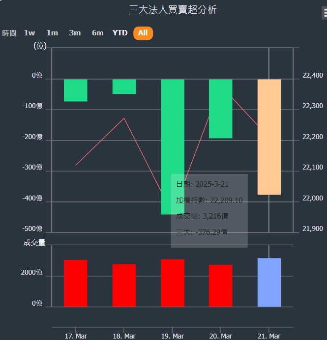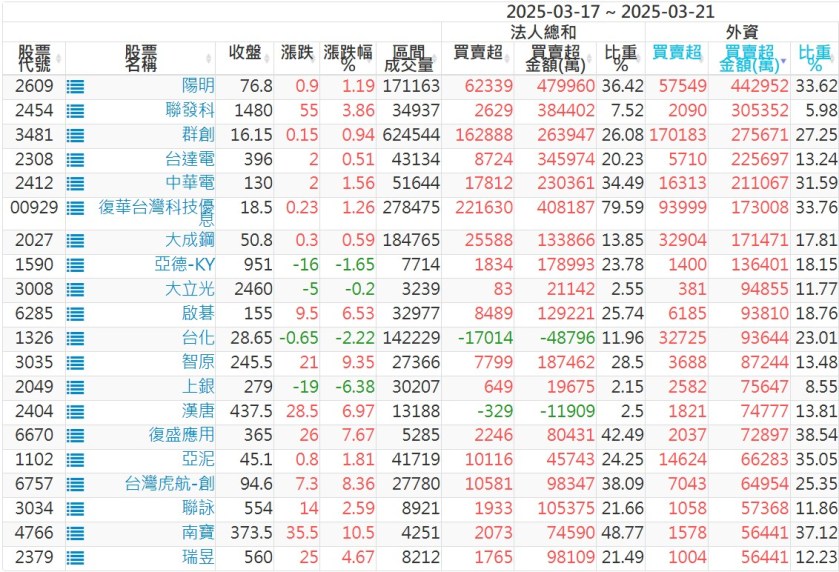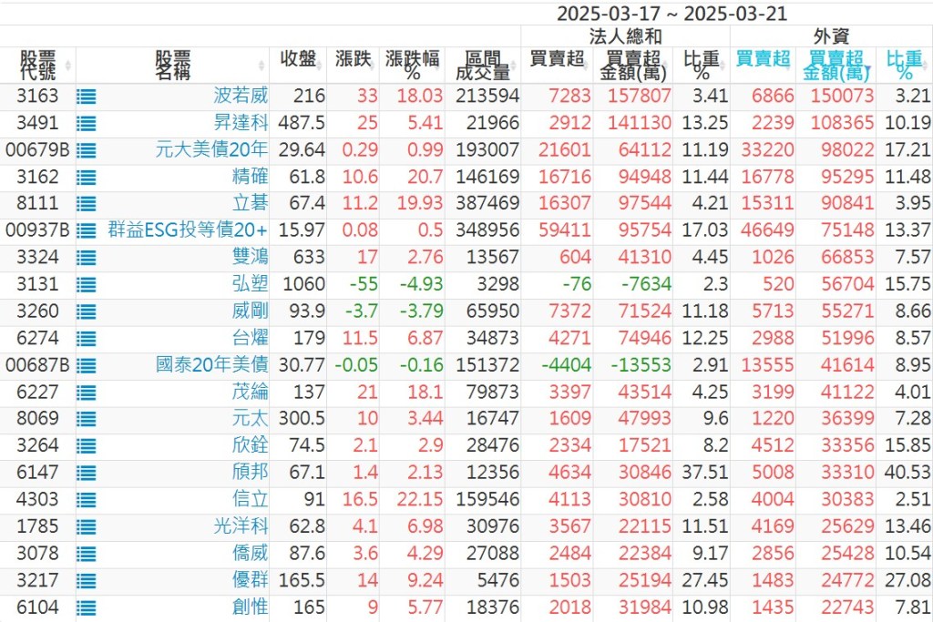 2025/03/17~2025/03/21近5日【外資】買賣超個股 2025-03-23 股狗網小編 投資誌-大盤 發表留言 外資本周累積【賣超】約376億元。 【上市外資買超個股】(以金額排行,單位:萬) 【上市外資賣超個股】(以金額排行,單位:萬) 【上櫃外資買超個股】(以金額排行,單位:萬) 【上櫃外資賣超個股】(以金額排行,單位:萬) 免責宣言 本網站文章所提供資訊僅供參考,並無任何推介買賣之意,投資人應自行承擔交易風險。 分享此文: 按一下即可分享至 X(在新視窗中開啟) X 按一下以分享至 Facebook(在新視窗中開啟) Facebook 喜歡 正在載入...