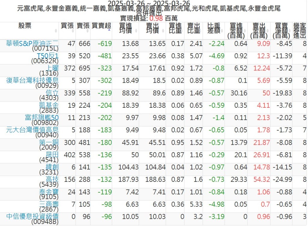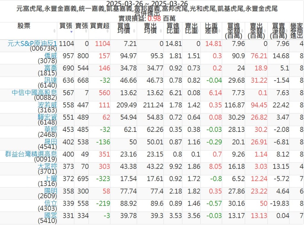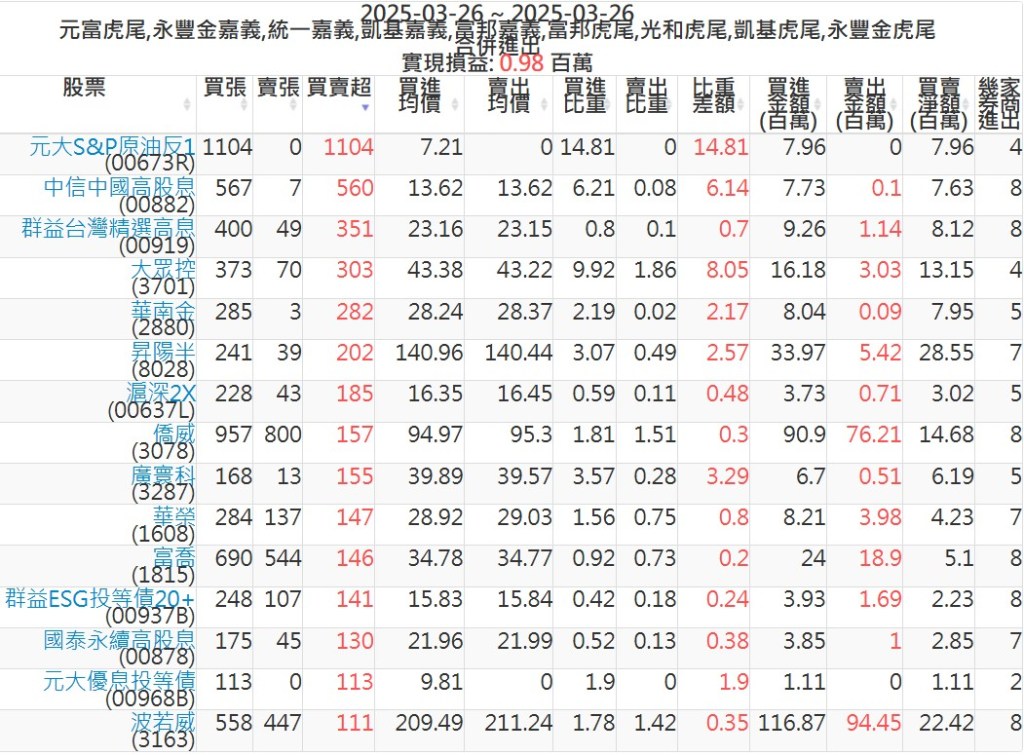 2025-0326主力買賣超個股 2025-03-26 股狗網小編 籌碼面每日資訊 發表留言 可參考下文 『如何查詢當沖、隔日沖分公司券商買賣』 主力當沖券商: 『元富虎尾』,『永豐金嘉義』,『統一嘉義』,『凱基嘉義』,『富邦嘉義』,『富邦虎尾』,『光和虎尾』,『凱基虎尾』,『永豐金虎尾』。 『當沖標的』 『買超股票』 『賣超股票』 免責宣言 本網站文章所提供資訊僅供參考,並無任何推介買賣之意,投資人應自行承擔交易風險。 分享此文: 按一下即可分享至 X(在新視窗中開啟) X 按一下以分享至 Facebook(在新視窗中開啟) Facebook 喜歡 正在載入...