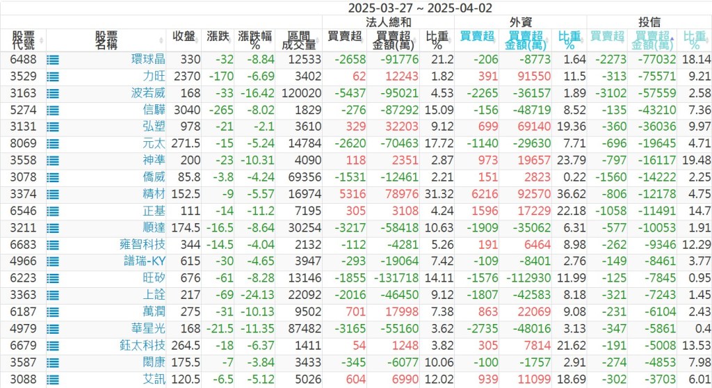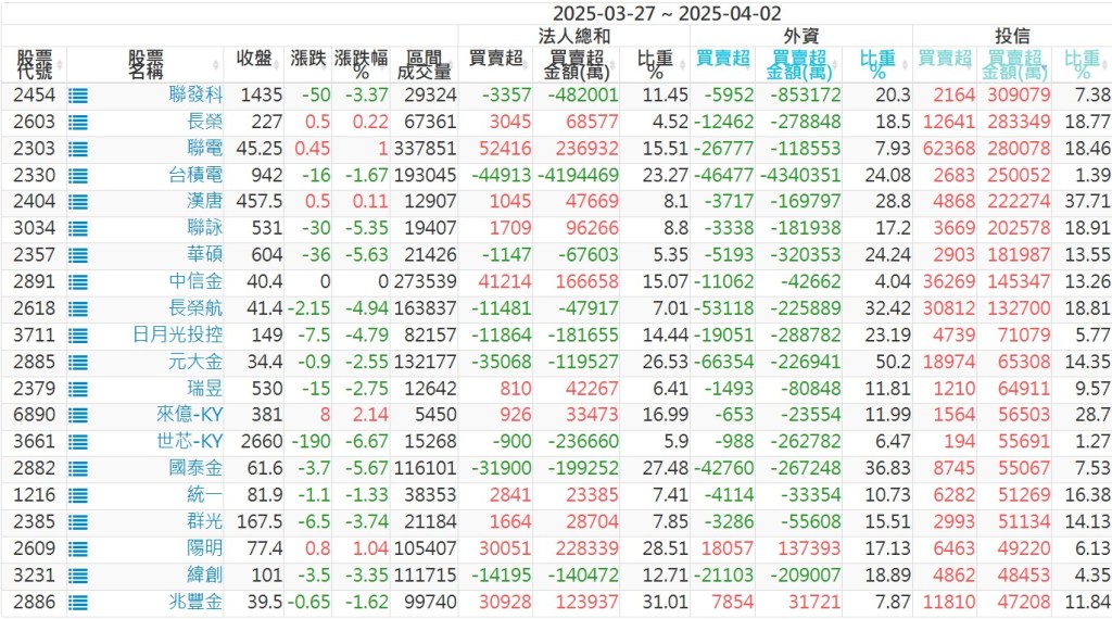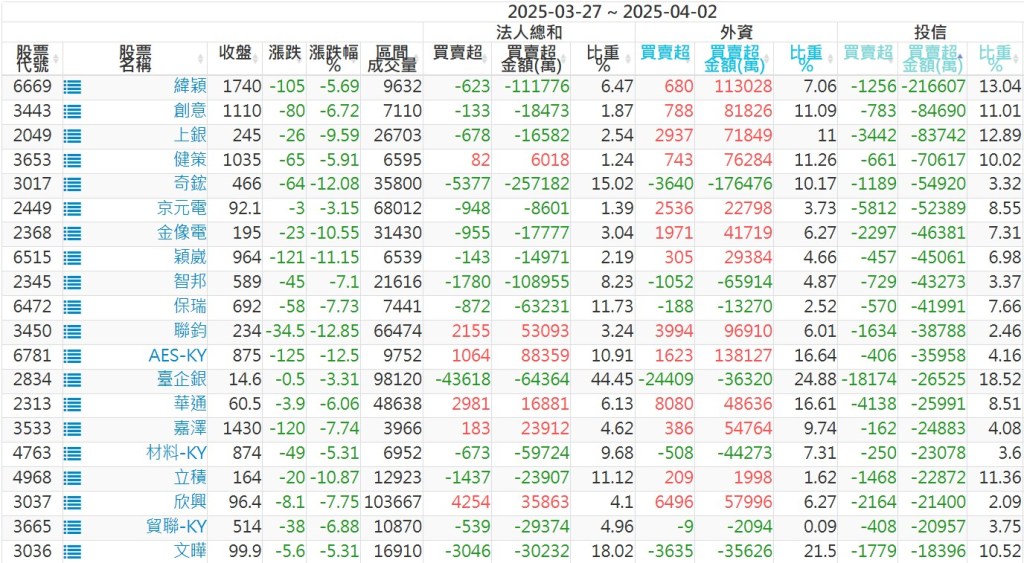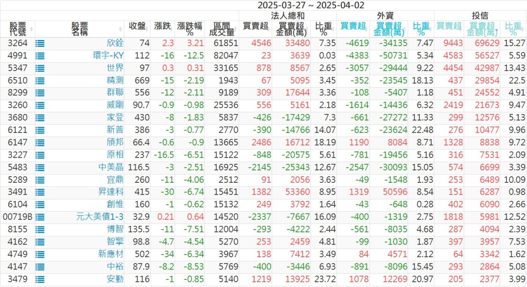 2025/03/27~2025/04/02近5日【投信】買賣超個股 2025-04-06 股狗網小編 投資誌-大盤 發表留言 【上市投信買超個股】(以金額排行,單位:萬) 【上市投信賣超個股】(以金額排行,單位:萬) 【上櫃投信買超個股】(以金額排行,單位:萬) 【上櫃投信賣超個股】(以金額排行,單位:萬) 免責宣言 本網站文章所提供資訊僅供參考,並無任何推介買賣之意,投資人應自行承擔交易風險。 分享此文: 按一下即可分享至 X(在新視窗中開啟) X 按一下以分享至 Facebook(在新視窗中開啟) Facebook 喜歡 正在載入...