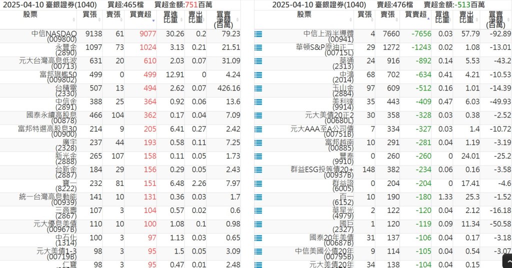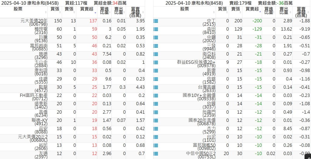 2025-0410關鍵券商買賣超 2025-04-10 股狗網小編 籌碼面每日資訊 發表留言 關鍵券商買賣超: 臺銀證券(1040): 台灣摩根士丹利(1470): 凱基台北(9268): 凱基信義(9216): 元大土城永寧(9875): 康和永和(845B) : 富邦建國(9658): 免責宣言 本網站文章所提供資訊僅供參考,並無任何推介買賣之意,投資人應自行承擔交易風險。 分享此文: 按一下即可分享至 X(在新視窗中開啟) X 按一下以分享至 Facebook(在新視窗中開啟) Facebook 喜歡 正在載入...