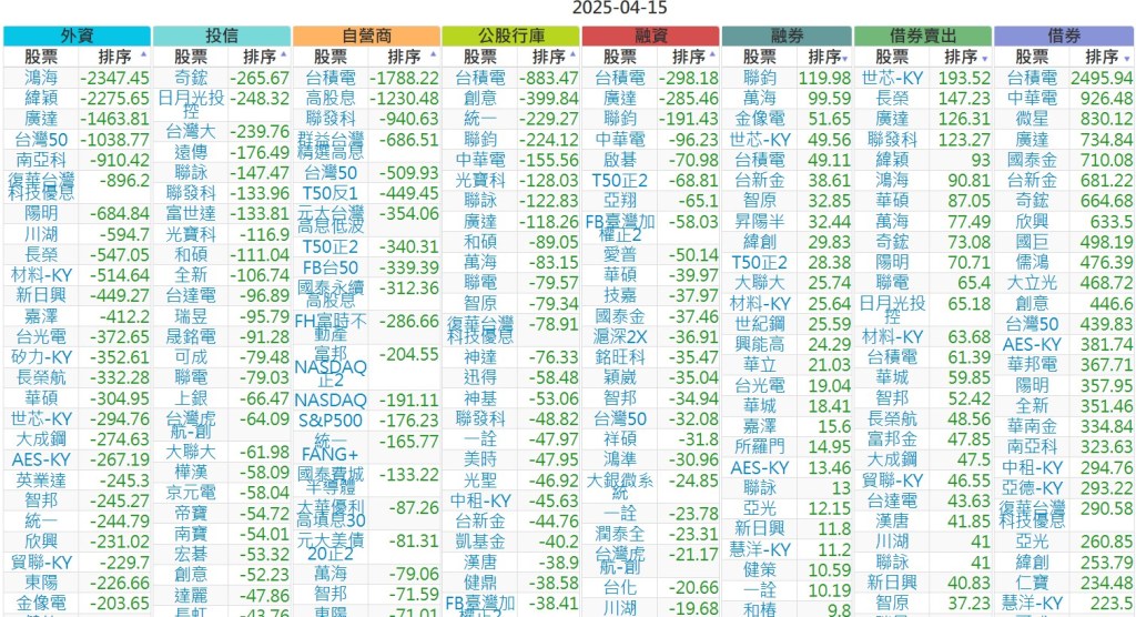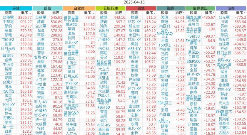 2025-0415【外資、投信】買賣超個股 2025-04-15 股狗網小編 投資誌-大盤 發表留言 上市:【外資、投信】買超(依金額) (單位:百萬) 上市:【外資、投信】賣超(依金額) (單位:百萬) 上市:【外資、投信】買超(依張數) (單位:張數) 上市:【外資、投信】賣超(依張數) (單位:張數) 免責宣言 本網站文章所提供資訊僅供參考,並無任何推介買賣之意,投資人應自行承擔交易風險。 分享此文: 按一下即可分享至 X(在新視窗中開啟) X 按一下以分享至 Facebook(在新視窗中開啟) Facebook 喜歡 正在載入...
