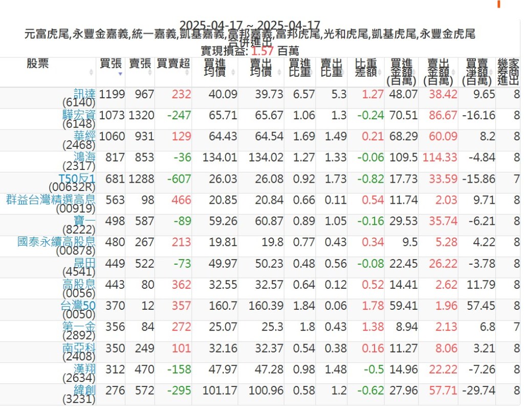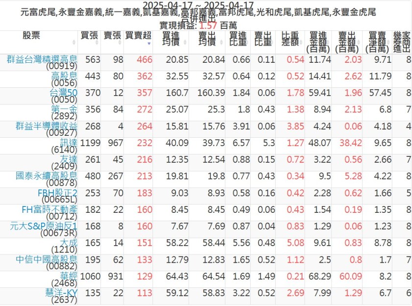 2025-0417主力買賣超個股 2025-04-17 股狗網小編 籌碼面每日資訊 發表留言 可參考下文 『如何查詢當沖、隔日沖分公司券商買賣』 主力當沖券商: 『元富虎尾』,『永豐金嘉義』,『統一嘉義』,『凱基嘉義』,『富邦嘉義』,『富邦虎尾』,『光和虎尾』,『凱基虎尾』,『永豐金虎尾』。 『當沖標的』 『買超股票』 『賣超股票』 免責宣言 本網站文章所提供資訊僅供參考,並無任何推介買賣之意,投資人應自行承擔交易風險。 分享此文: 按一下即可分享至 X(在新視窗中開啟) X 按一下以分享至 Facebook(在新視窗中開啟) Facebook 喜歡 正在載入...