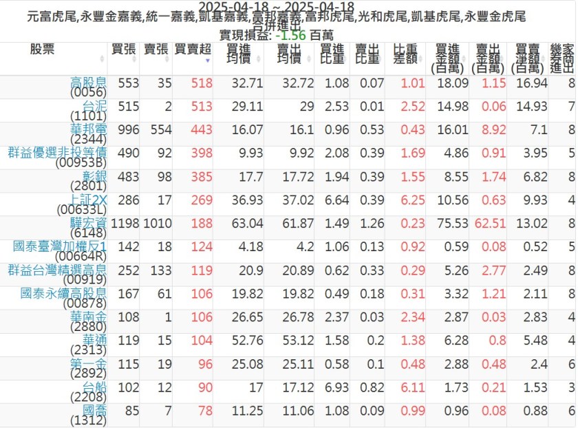 2025-0418主力買賣超個股 2025-04-18 股狗網小編 籌碼面每日資訊 發表留言 可參考下文 『如何查詢當沖、隔日沖分公司券商買賣』 主力當沖券商: 『元富虎尾』,『永豐金嘉義』,『統一嘉義』,『凱基嘉義』,『富邦嘉義』,『富邦虎尾』,『光和虎尾』,『凱基虎尾』,『永豐金虎尾』。 『當沖標的』 『買超股票』 『賣超股票』 免責宣言 本網站文章所提供資訊僅供參考,並無任何推介買賣之意,投資人應自行承擔交易風險。 分享此文: 按一下即可分享至 X(在新視窗中開啟) X 按一下以分享至 Facebook(在新視窗中開啟) Facebook 喜歡 正在載入...