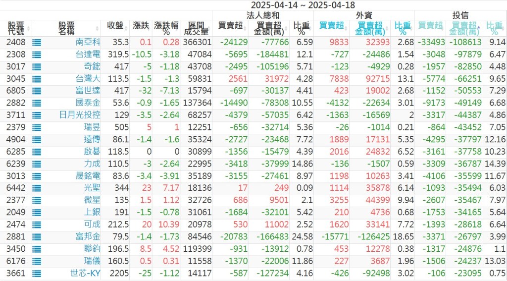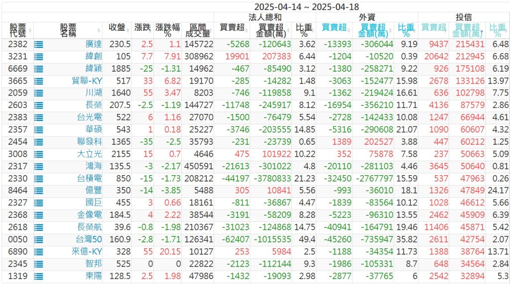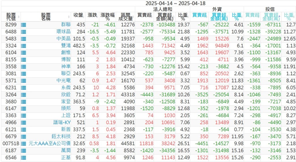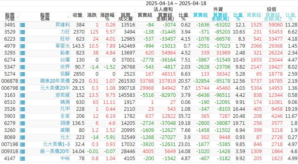 2025/04/14~2025/04/18近5日【投信】買賣超個股 2025-04-20 股狗網小編 投資誌-大盤 發表留言 【上市投信買超個股】(以金額排行,單位:萬) 【上市投信賣超個股】(以金額排行,單位:萬) 【上櫃投信買超個股】(以金額排行,單位:萬) 【上櫃投信賣超個股】(以金額排行,單位:萬) 免責宣言 本網站文章所提供資訊僅供參考,並無任何推介買賣之意,投資人應自行承擔交易風險。 分享此文: 按一下即可分享至 X(在新視窗中開啟) X 按一下以分享至 Facebook(在新視窗中開啟) Facebook 喜歡 正在載入...