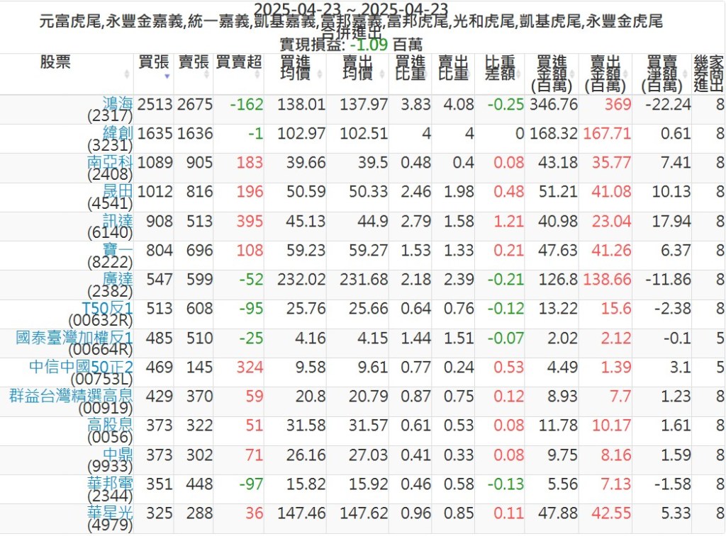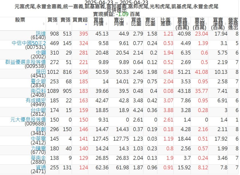 2025-0423主力買賣超個股 2025-04-23 股狗網小編 籌碼面每日資訊 發表留言 可參考下文 『如何查詢當沖、隔日沖分公司券商買賣』 主力當沖券商: 『元富虎尾』,『永豐金嘉義』,『統一嘉義』,『凱基嘉義』,『富邦嘉義』,『富邦虎尾』,『光和虎尾』,『凱基虎尾』,『永豐金虎尾』。 『當沖標的』 『買超股票』 『賣超股票』 免責宣言 本網站文章所提供資訊僅供參考,並無任何推介買賣之意,投資人應自行承擔交易風險。 分享此文: 按一下即可分享至 X(在新視窗中開啟) X 按一下以分享至 Facebook(在新視窗中開啟) Facebook 喜歡 正在載入...