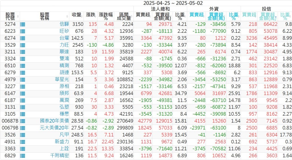 2025/04/25~2025/05/02近5日【投信】買賣超個股 2025-05-04 股狗網小編 投資誌-大盤 發表留言 【上市投信買超個股】(以金額排行,單位:萬) 【上市投信賣超個股】(以金額排行,單位:萬) 【上櫃投信買超個股】(以金額排行,單位:萬) 【上櫃投信賣超個股】(以金額排行,單位:萬) 免責宣言 本網站文章所提供資訊僅供參考,並無任何推介買賣之意,投資人應自行承擔交易風險。 分享此文: 按一下即可分享至 X(在新視窗中開啟) X 按一下以分享至 Facebook(在新視窗中開啟) Facebook 喜歡 正在載入...