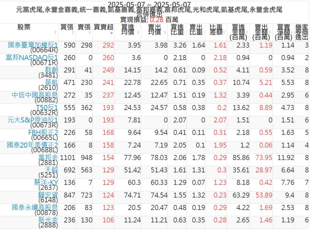 2025-0507主力買賣超個股 2025-05-07 股狗網小編 籌碼面每日資訊 發表留言 可參考下文 『如何查詢當沖、隔日沖分公司券商買賣』 主力當沖券商: 『元富虎尾』,『永豐金嘉義』,『統一嘉義』,『凱基嘉義』,『富邦嘉義』,『富邦虎尾』,『光和虎尾』,『凱基虎尾』,『永豐金虎尾』。 『當沖標的』 『買超股票』 『賣超股票』 免責宣言 本網站文章所提供資訊僅供參考,並無任何推介買賣之意,投資人應自行承擔交易風險。 分享此文: 按一下即可分享至 X(在新視窗中開啟) X 按一下以分享至 Facebook(在新視窗中開啟) Facebook 喜歡 正在載入...