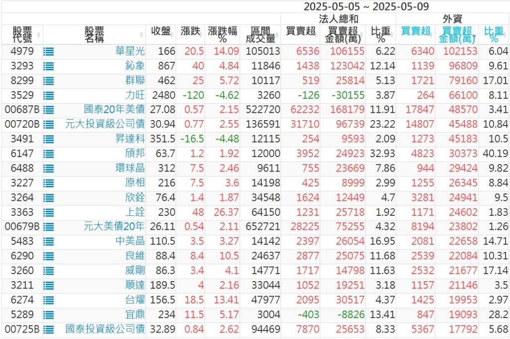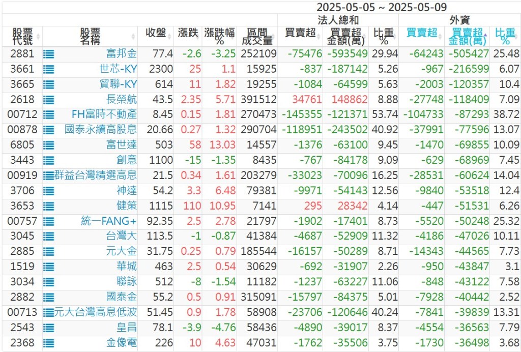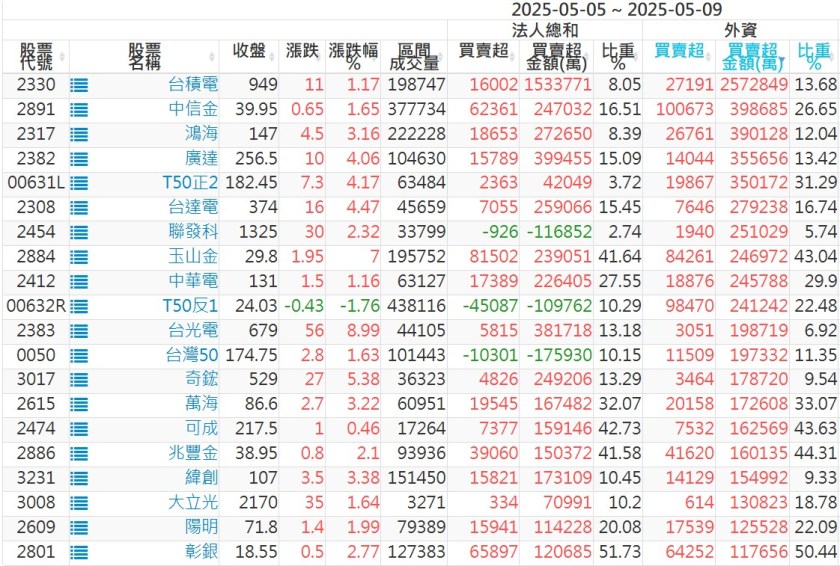 2025/05/05~2025/05/09近5日【外資】買賣超個股 2025-05-11 股狗網小編 投資誌-大盤 發表留言 外資本周累積【買超】約781億元。 【上市外資買超個股】(以金額排行,單位:萬) 【上市外資賣超個股】(以金額排行,單位:萬) 【上櫃外資買超個股】(以金額排行,單位:萬) 【上櫃外資賣超個股】(以金額排行,單位:萬) 免責宣言 本網站文章所提供資訊僅供參考,並無任何推介買賣之意,投資人應自行承擔交易風險。 分享此文: 按一下即可分享至 X(在新視窗中開啟) X 按一下以分享至 Facebook(在新視窗中開啟) Facebook 喜歡 正在載入...
