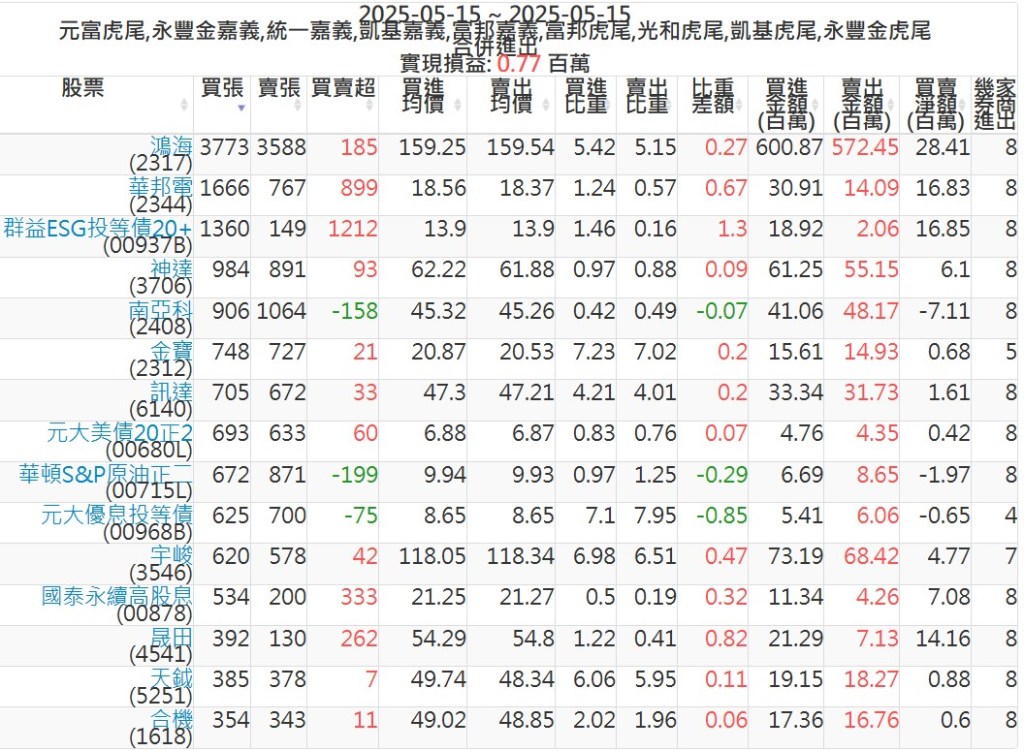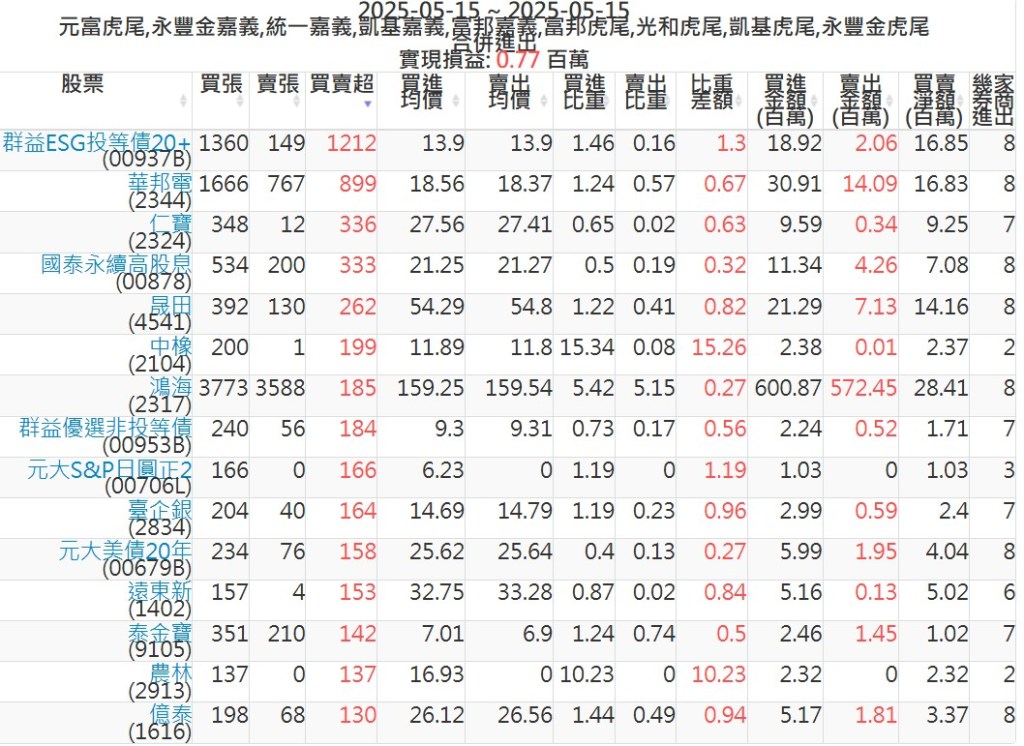 2025-0515主力買賣超個股 2025-05-15 股狗網小編 籌碼面每日資訊 發表留言 可參考下文 『如何查詢當沖、隔日沖分公司券商買賣』 主力當沖券商: 『元富虎尾』,『永豐金嘉義』,『統一嘉義』,『凱基嘉義』,『富邦嘉義』,『富邦虎尾』,『光和虎尾』,『凱基虎尾』,『永豐金虎尾』。 『當沖標的』 『買超股票』 『賣超股票』 免責宣言 本網站文章所提供資訊僅供參考,並無任何推介買賣之意,投資人應自行承擔交易風險。 分享此文: 按一下即可分享至 X(在新視窗中開啟) X 按一下以分享至 Facebook(在新視窗中開啟) Facebook 喜歡 正在載入...