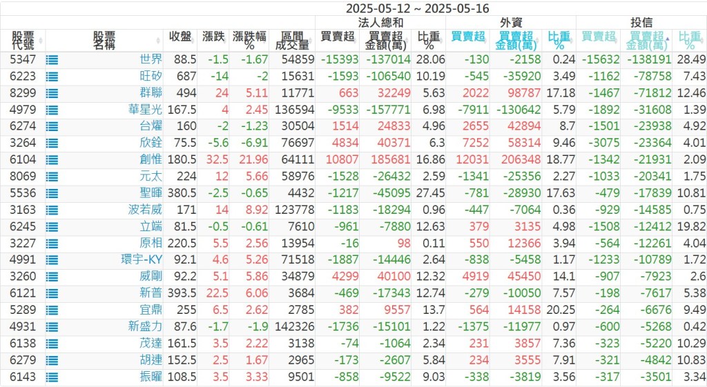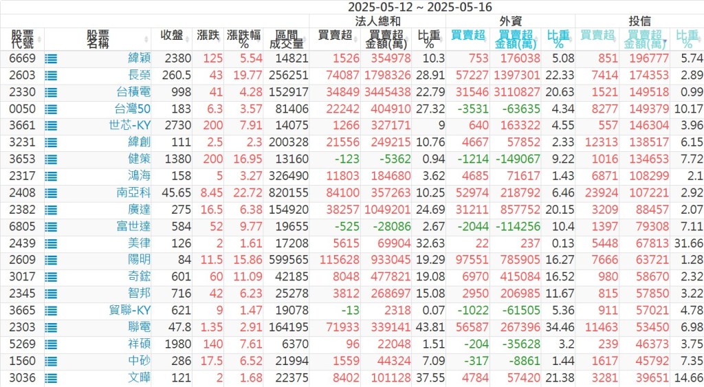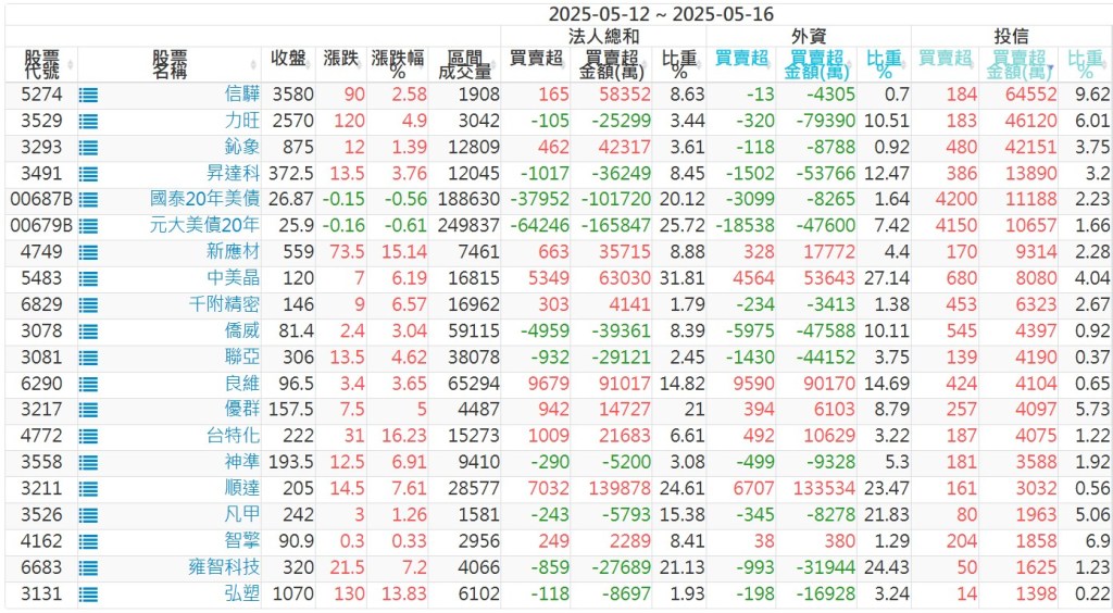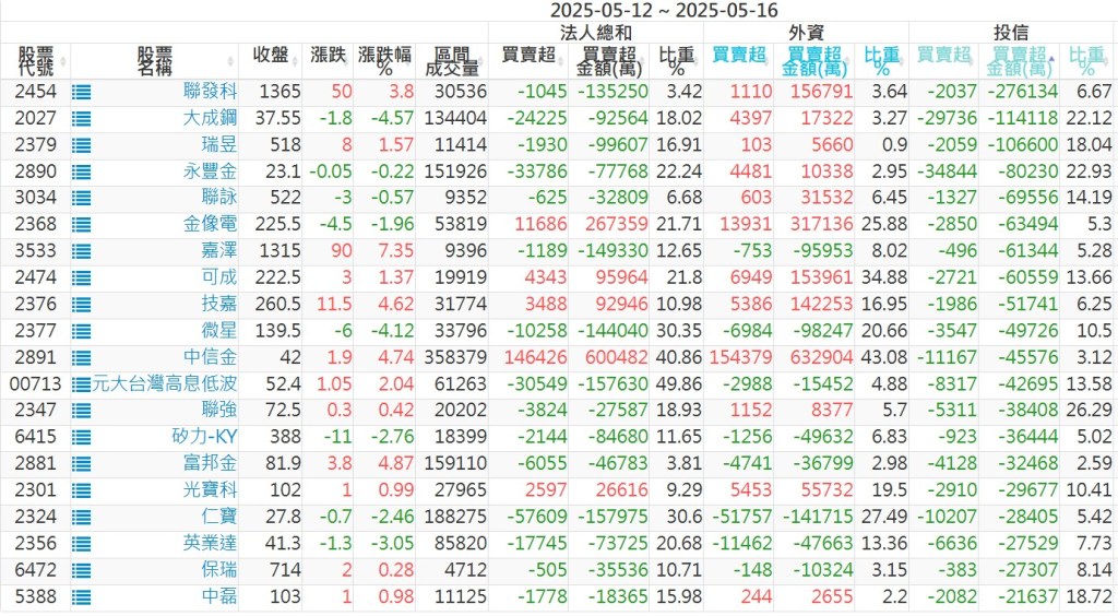 2025/05/12~2025/05/16近5日【投信】買賣超個股 2025-05-18 股狗網小編 投資誌-大盤 發表留言 【上市投信買超個股】(以金額排行,單位:萬) 【上市投信賣超個股】(以金額排行,單位:萬) 【上櫃投信買超個股】(以金額排行,單位:萬) 【上櫃投信賣超個股】(以金額排行,單位:萬) 免責宣言 本網站文章所提供資訊僅供參考,並無任何推介買賣之意,投資人應自行承擔交易風險。 分享此文: 按一下即可分享至 X(在新視窗中開啟) X 按一下以分享至 Facebook(在新視窗中開啟) Facebook 喜歡 正在載入...