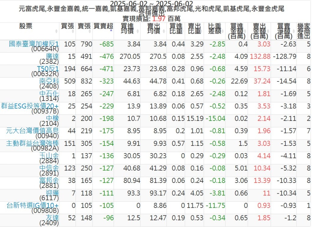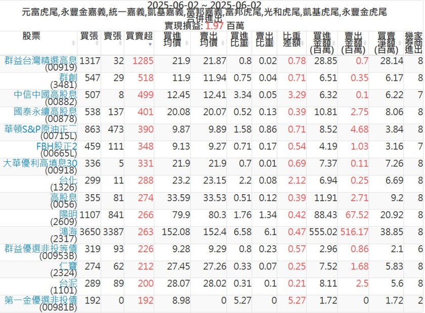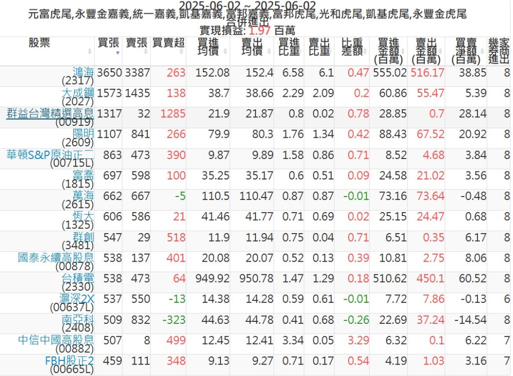 2025-0602主力買賣超個股 2025-06-02 股狗網小編 籌碼面每日資訊 發表留言 可參考下文 『如何查詢當沖、隔日沖分公司券商買賣』 主力當沖券商: 『元富虎尾』,『永豐金嘉義』,『統一嘉義』,『凱基嘉義』,『富邦嘉義』,『富邦虎尾』,『光和虎尾』,『凱基虎尾』,『永豐金虎尾』。 『當沖標的』 『買超股票』 『賣超股票』 免責宣言 本網站文章所提供資訊僅供參考,並無任何推介買賣之意,投資人應自行承擔交易風險。 分享此文: 按一下即可分享至 X(在新視窗中開啟) X 按一下以分享至 Facebook(在新視窗中開啟) Facebook 喜歡 正在載入...