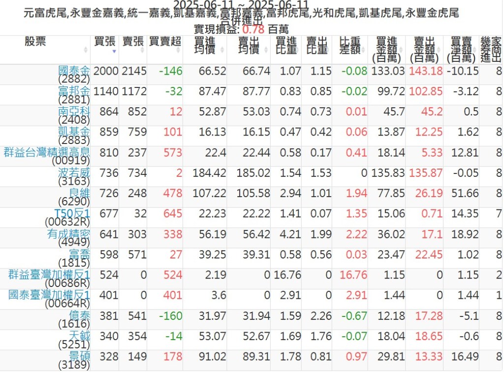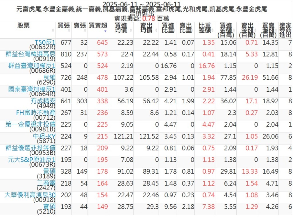 2025-0611主力買賣超個股 2025-06-11 股狗網小編 籌碼面每日資訊 發表留言 可參考下文 『如何查詢當沖、隔日沖分公司券商買賣』 主力當沖券商: 『元富虎尾』,『永豐金嘉義』,『統一嘉義』,『凱基嘉義』,『富邦嘉義』,『富邦虎尾』,『光和虎尾』,『凱基虎尾』,『永豐金虎尾』。 『當沖標的』 『買超股票』 『賣超股票』 免責宣言 本網站文章所提供資訊僅供參考,並無任何推介買賣之意,投資人應自行承擔交易風險。 分享此文: 按一下即可分享至 X(在新視窗中開啟) X 按一下以分享至 Facebook(在新視窗中開啟) Facebook 喜歡 正在載入...