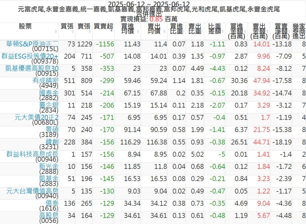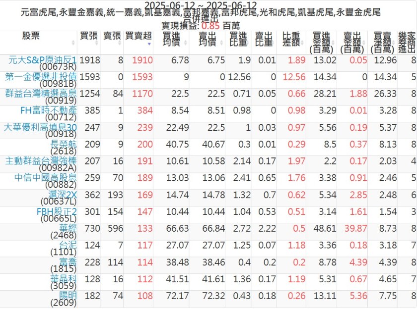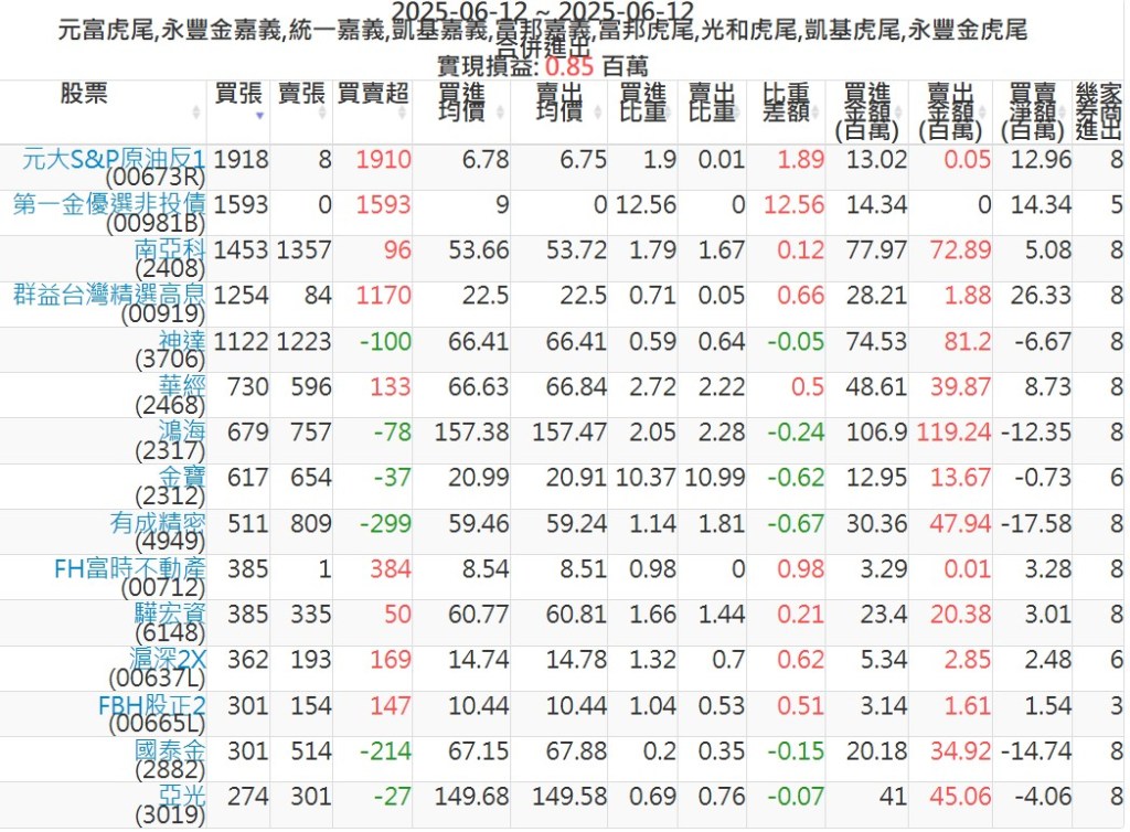 2025-0612主力買賣超個股 2025-06-12 股狗網小編 籌碼面每日資訊 發表留言 可參考下文 『如何查詢當沖、隔日沖分公司券商買賣』 主力當沖券商: 『元富虎尾』,『永豐金嘉義』,『統一嘉義』,『凱基嘉義』,『富邦嘉義』,『富邦虎尾』,『光和虎尾』,『凱基虎尾』,『永豐金虎尾』。 『當沖標的』 『買超股票』 『賣超股票』 免責宣言 本網站文章所提供資訊僅供參考,並無任何推介買賣之意,投資人應自行承擔交易風險。 分享此文: 按一下即可分享至 X(在新視窗中開啟) X 按一下以分享至 Facebook(在新視窗中開啟) Facebook 喜歡 正在載入...