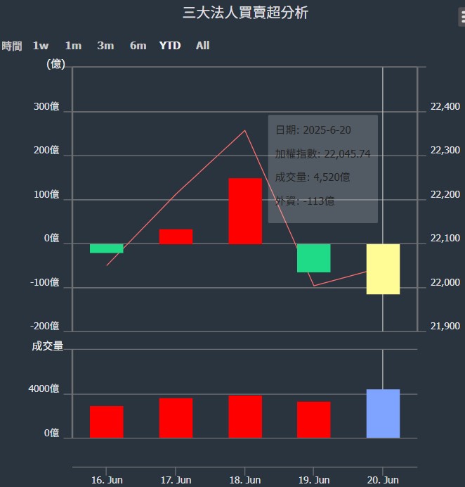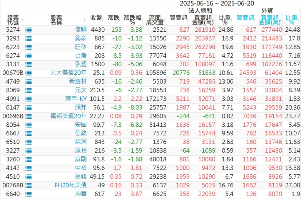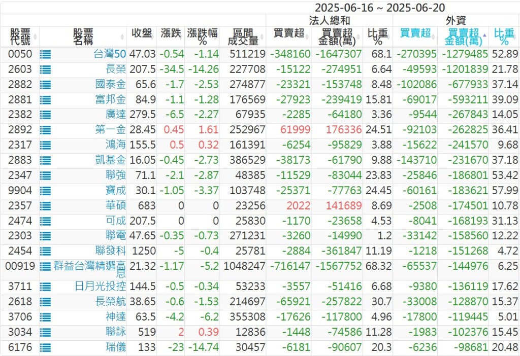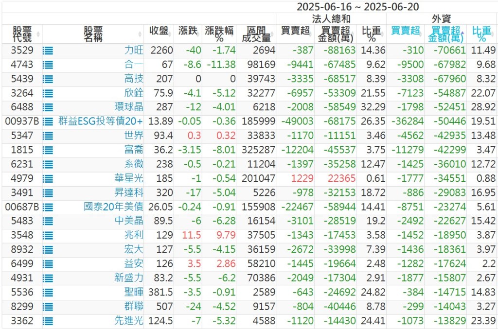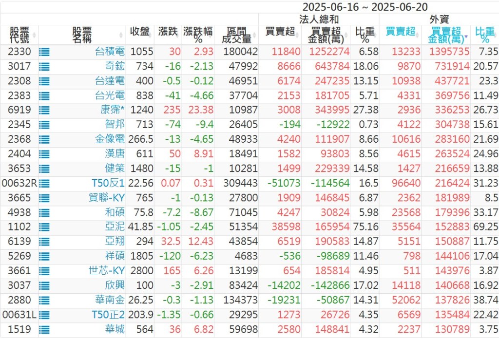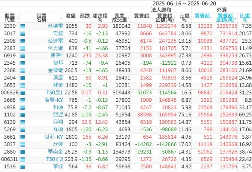 2025/06/16~2025/06/20近5日【外資】買賣超個股 2025-06-22 股狗網小編 投資誌-大盤 發表留言 外資本周累積【賣超】約113億元。 【上市外資買超個股】(以金額排行,單位:萬) 【上市外資賣超個股】(以金額排行,單位:萬) 【上櫃外資買超個股】(以金額排行,單位:萬) 【上櫃外資賣超個股】(以金額排行,單位:萬) 免責宣言 本網站文章所提供資訊僅供參考,並無任何推介買賣之意,投資人應自行承擔交易風險。 分享此文: 按一下即可分享至 X(在新視窗中開啟) X 按一下以分享至 Facebook(在新視窗中開啟) Facebook 喜歡 正在載入...