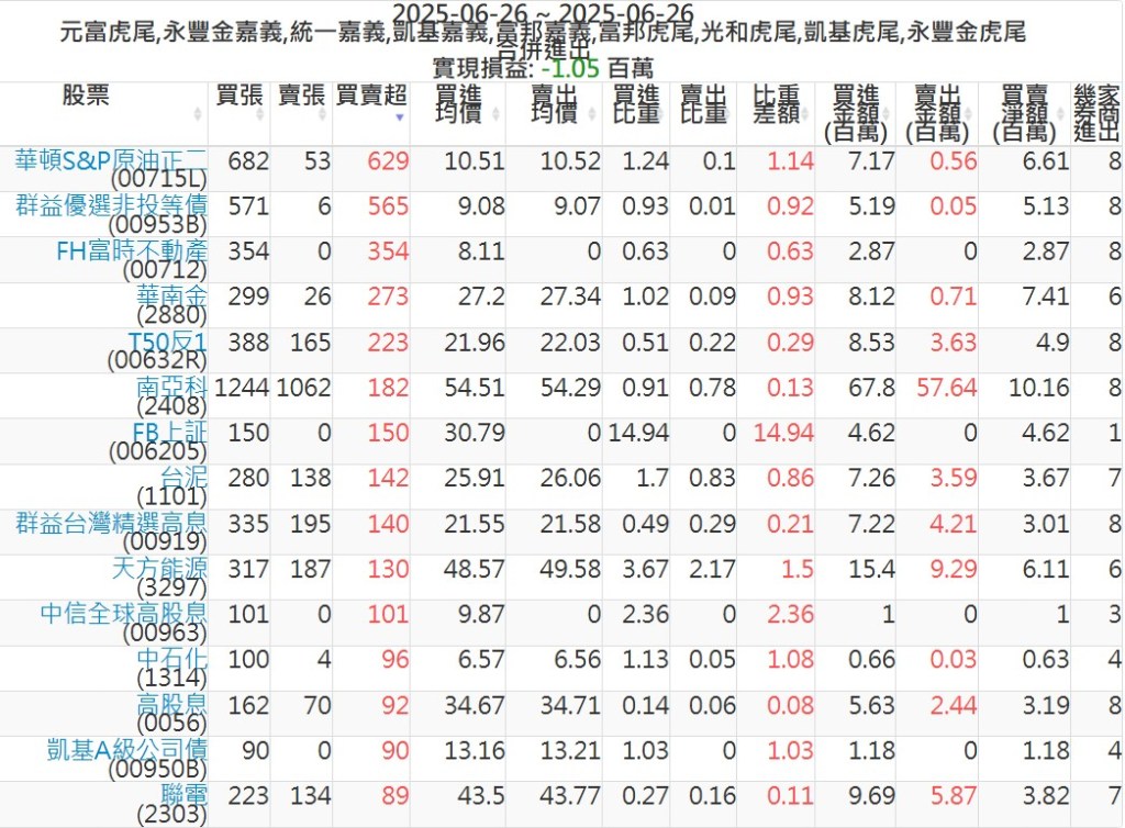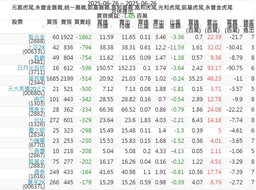 2025-0626主力買賣超個股 2025-06-26 股狗網小編 籌碼面每日資訊 發表留言 可參考下文 『如何查詢當沖、隔日沖分公司券商買賣』 主力當沖券商: 『元富虎尾』,『永豐金嘉義』,『統一嘉義』,『凱基嘉義』,『富邦嘉義』,『富邦虎尾』,『光和虎尾』,『凱基虎尾』,『永豐金虎尾』。 『當沖標的』 『買超股票』 『賣超股票』 免責宣言 本網站文章所提供資訊僅供參考,並無任何推介買賣之意,投資人應自行承擔交易風險。 分享此文: 按一下即可分享至 X(在新視窗中開啟) X 按一下以分享至 Facebook(在新視窗中開啟) Facebook 喜歡 正在載入...