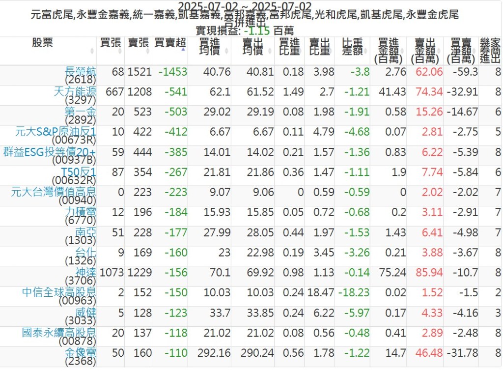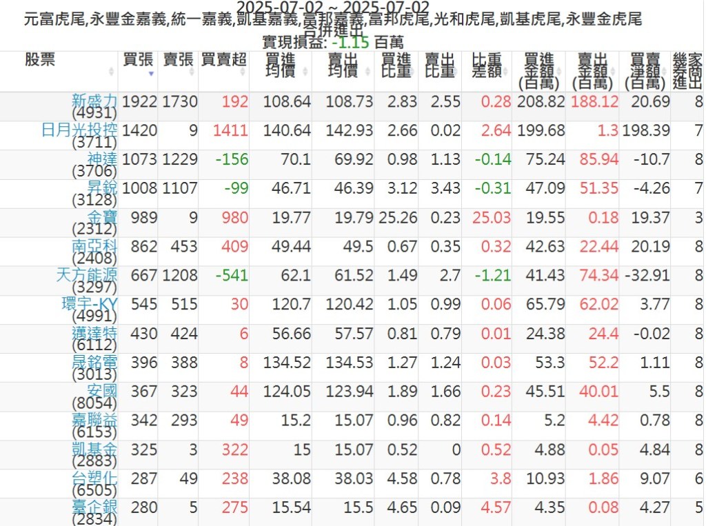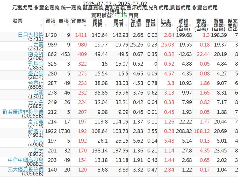 2025-0702主力買賣超個股 2025-07-02 股狗網小編 籌碼面每日資訊 發表留言 可參考下文 『如何查詢當沖、隔日沖分公司券商買賣』 主力當沖券商: 『元富虎尾』,『永豐金嘉義』,『統一嘉義』,『凱基嘉義』,『富邦嘉義』,『富邦虎尾』,『光和虎尾』,『凱基虎尾』,『永豐金虎尾』。 『當沖標的』 『買超股票』 『賣超股票』 免責宣言 本網站文章所提供資訊僅供參考,並無任何推介買賣之意,投資人應自行承擔交易風險。 分享此文: 按一下即可分享至 X(在新視窗中開啟) X 按一下以分享至 Facebook(在新視窗中開啟) Facebook 喜歡 正在載入...