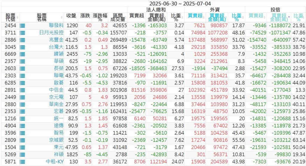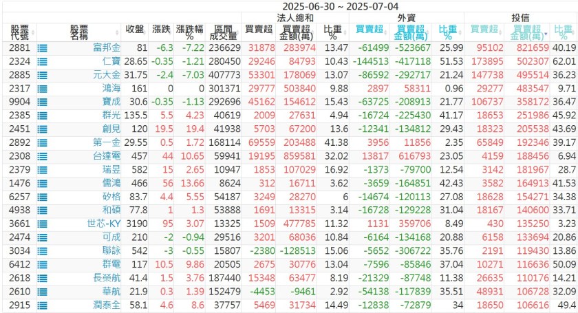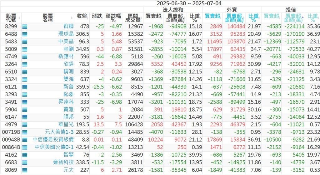 2025/06/30~2025/07/04近5日【投信】買賣超個股 2025-07-06 股狗網小編 投資誌-大盤 發表留言 【上市投信買超個股】(以金額排行,單位:萬) 【上市投信賣超個股】(以金額排行,單位:萬) 【上櫃投信買超個股】(以金額排行,單位:萬) 【上櫃投信賣超個股】(以金額排行,單位:萬) 免責宣言 本網站文章所提供資訊僅供參考,並無任何推介買賣之意,投資人應自行承擔交易風險。 分享此文: 按一下即可分享至 X(在新視窗中開啟) X 按一下以分享至 Facebook(在新視窗中開啟) Facebook 喜歡 正在載入...