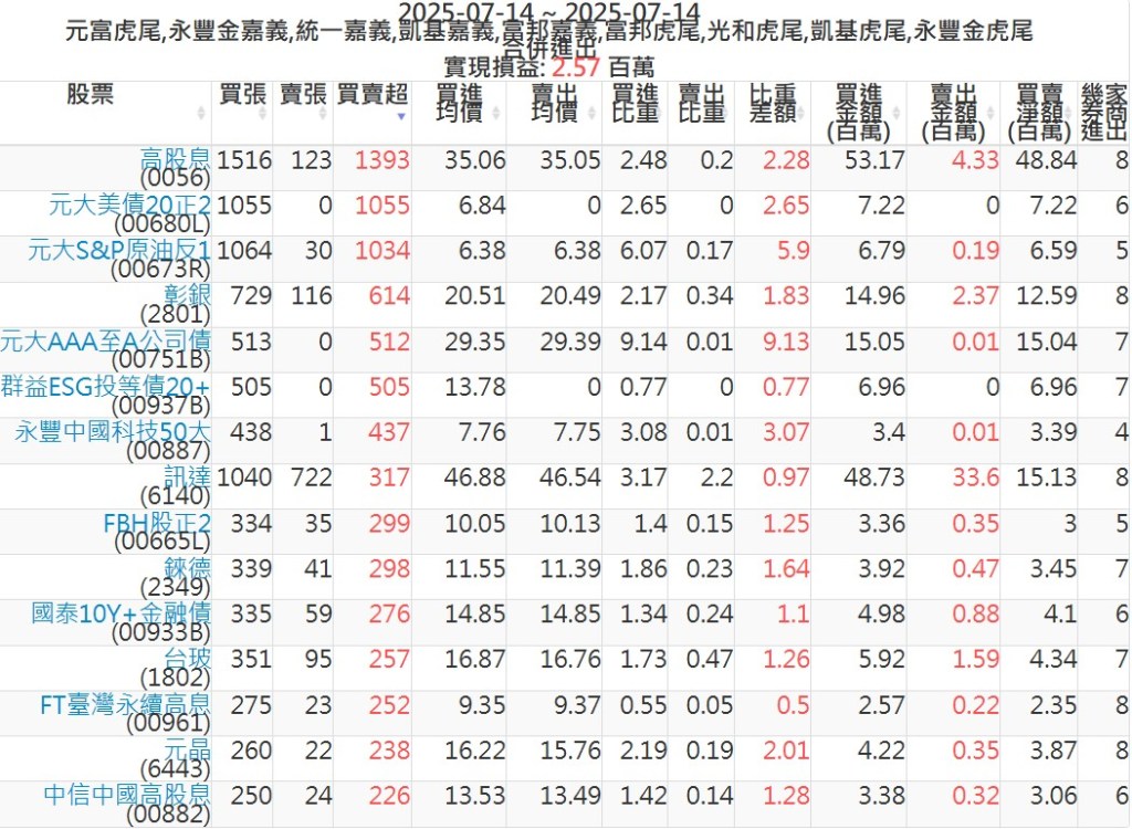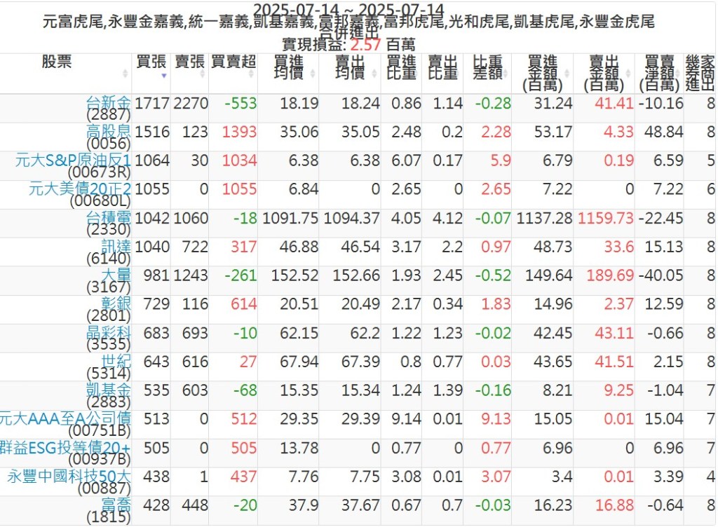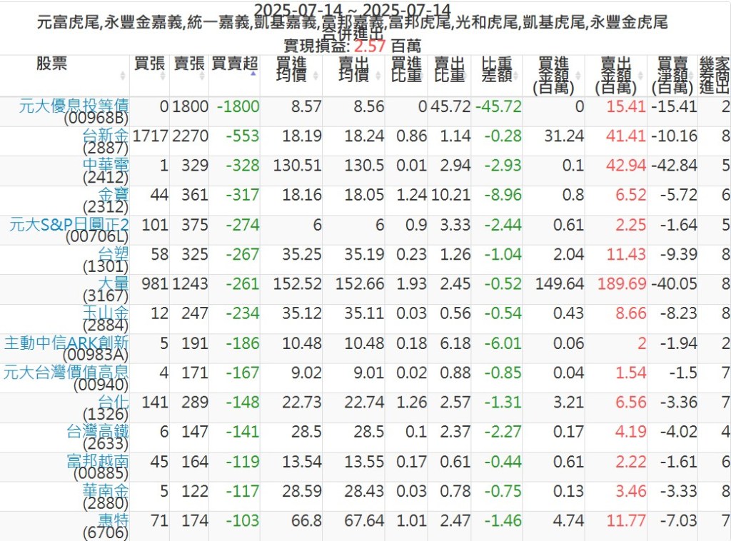 2025-0714主力買賣超個股 2025-07-14 股狗網小編 籌碼面每日資訊 發表留言 可參考下文 『如何查詢當沖、隔日沖分公司券商買賣』 主力當沖券商: 『元富虎尾』,『永豐金嘉義』,『統一嘉義』,『凱基嘉義』,『富邦嘉義』,『富邦虎尾』,『光和虎尾』,『凱基虎尾』,『永豐金虎尾』。 『當沖標的』 『買超股票』 『賣超股票』 免責宣言 本網站文章所提供資訊僅供參考,並無任何推介買賣之意,投資人應自行承擔交易風險。 分享此文: 按一下即可分享至 X(在新視窗中開啟) X 按一下以分享至 Facebook(在新視窗中開啟) Facebook 喜歡 正在載入...