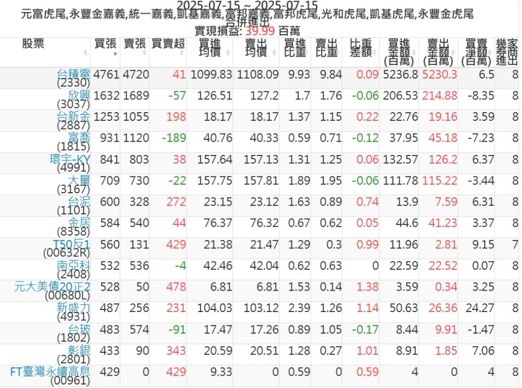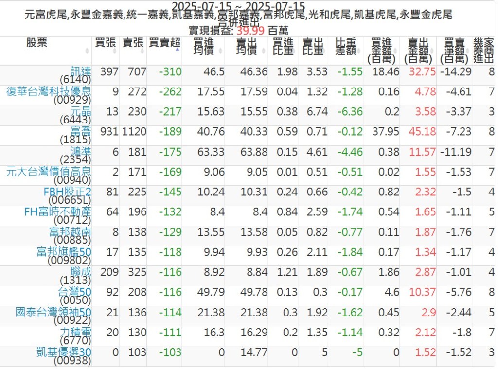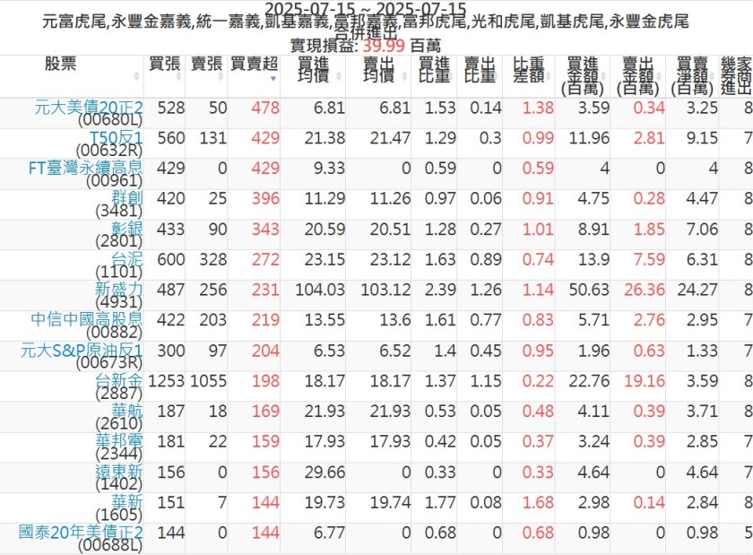 2025-0715主力買賣超個股 2025-07-15 股狗網小編 籌碼面每日資訊 發表留言 可參考下文 『如何查詢當沖、隔日沖分公司券商買賣』 主力當沖券商: 『元富虎尾』,『永豐金嘉義』,『統一嘉義』,『凱基嘉義』,『富邦嘉義』,『富邦虎尾』,『光和虎尾』,『凱基虎尾』,『永豐金虎尾』。 『當沖標的』 『買超股票』 『賣超股票』 免責宣言 本網站文章所提供資訊僅供參考,並無任何推介買賣之意,投資人應自行承擔交易風險。 分享此文: 按一下即可分享至 X(在新視窗中開啟) X 按一下以分享至 Facebook(在新視窗中開啟) Facebook 喜歡 正在載入...