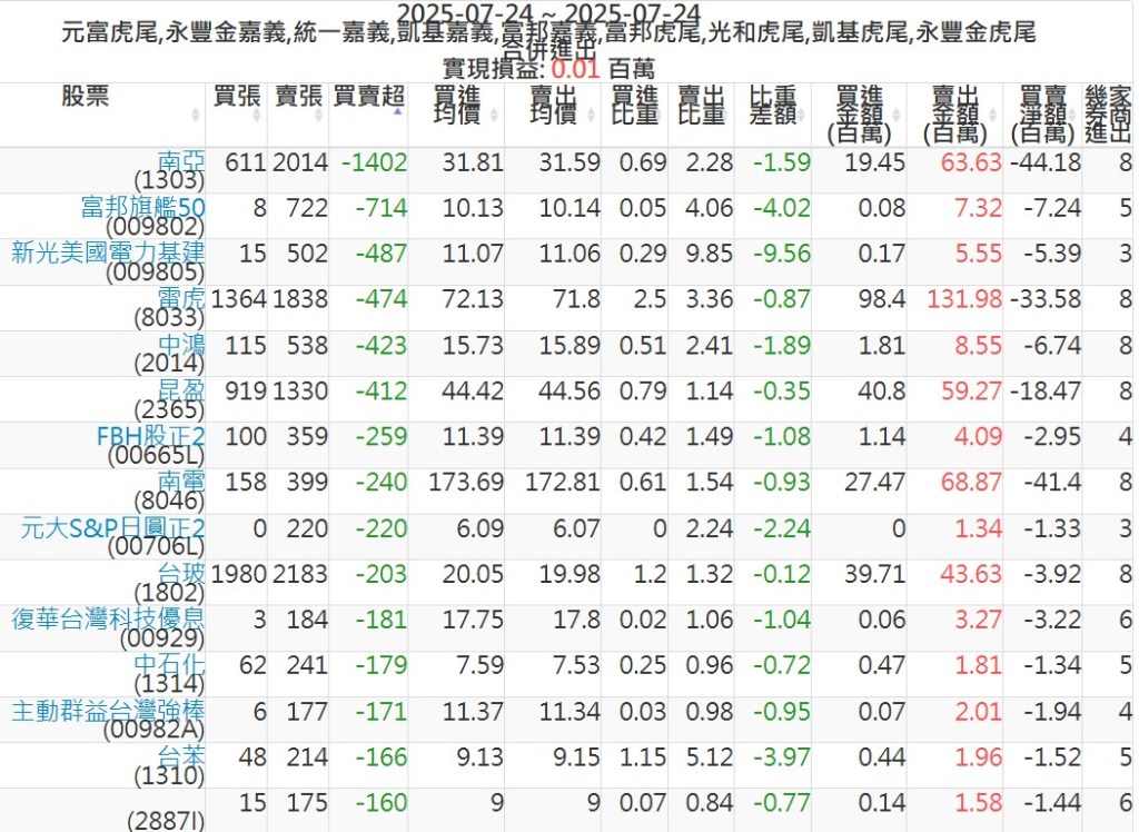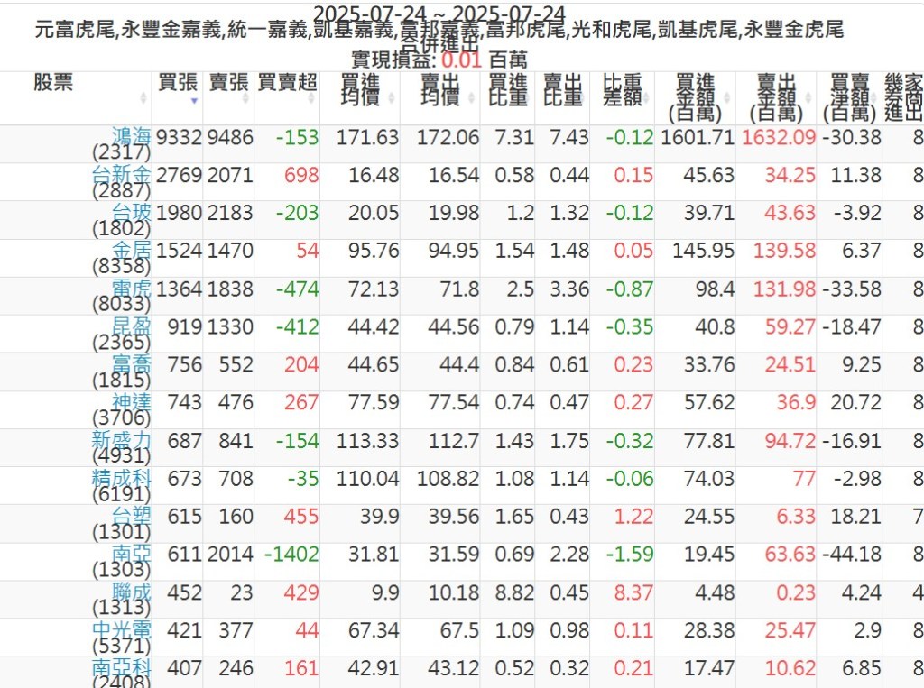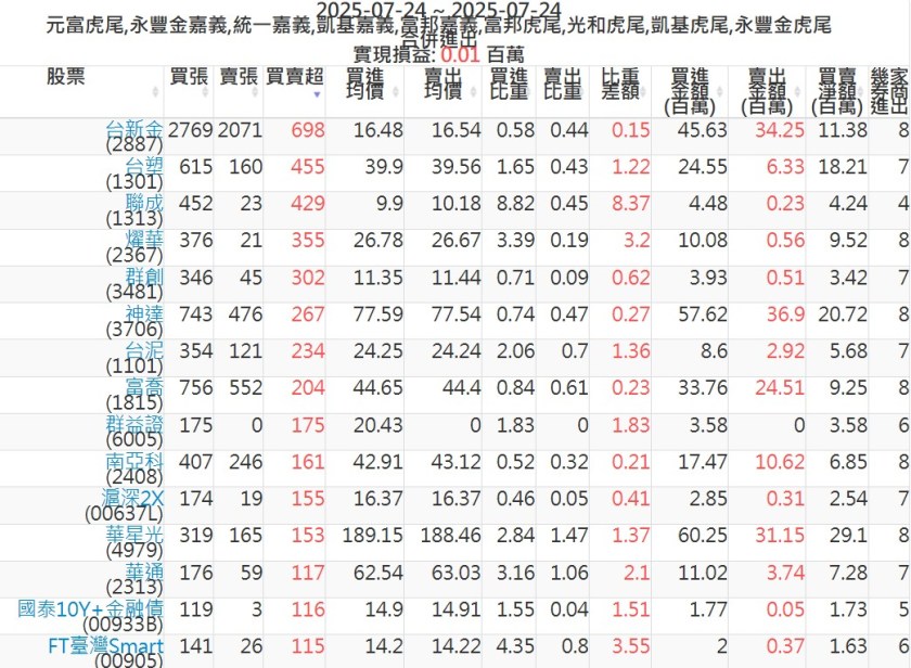 2025-0724主力買賣超個股 2025-07-24 股狗網小編 籌碼面每日資訊 發表留言 可參考下文 『如何查詢當沖、隔日沖分公司券商買賣』 主力當沖券商: 『元富虎尾』,『永豐金嘉義』,『統一嘉義』,『凱基嘉義』,『富邦嘉義』,『富邦虎尾』,『光和虎尾』,『凱基虎尾』,『永豐金虎尾』。 『當沖標的』 『買超股票』 『賣超股票』 免責宣言 本網站文章所提供資訊僅供參考,並無任何推介買賣之意,投資人應自行承擔交易風險。 分享此文: 按一下即可分享至 X(在新視窗中開啟) X 按一下以分享至 Facebook(在新視窗中開啟) Facebook 喜歡 正在載入...