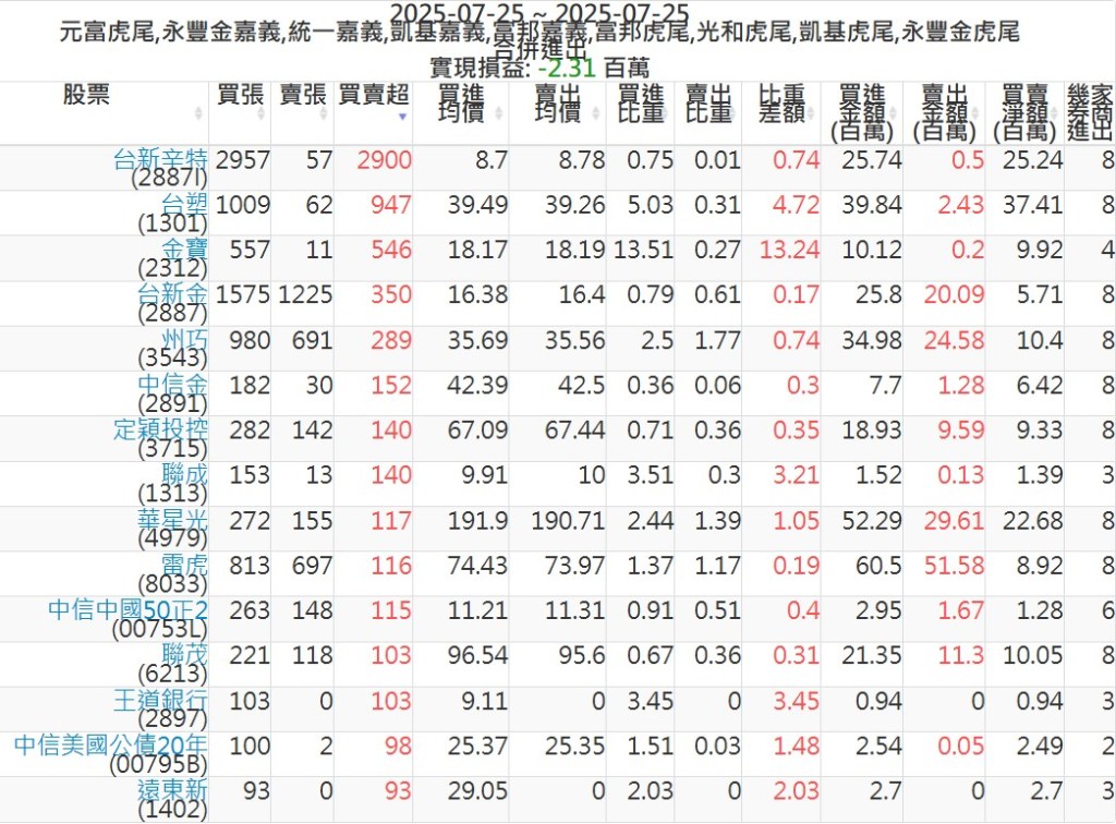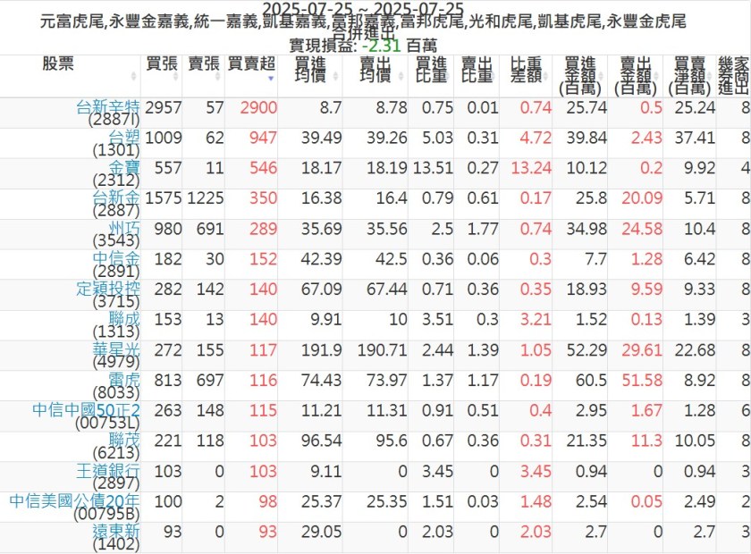 2025-0725主力買賣超個股 2025-07-25 股狗網小編 籌碼面每日資訊 發表留言 可參考下文 『如何查詢當沖、隔日沖分公司券商買賣』 主力當沖券商: 『元富虎尾』,『永豐金嘉義』,『統一嘉義』,『凱基嘉義』,『富邦嘉義』,『富邦虎尾』,『光和虎尾』,『凱基虎尾』,『永豐金虎尾』。 『當沖標的』 『買超股票』 『賣超股票』 免責宣言 本網站文章所提供資訊僅供參考,並無任何推介買賣之意,投資人應自行承擔交易風險。 分享此文: 按一下即可分享至 X(在新視窗中開啟) X 按一下以分享至 Facebook(在新視窗中開啟) Facebook 喜歡 正在載入...