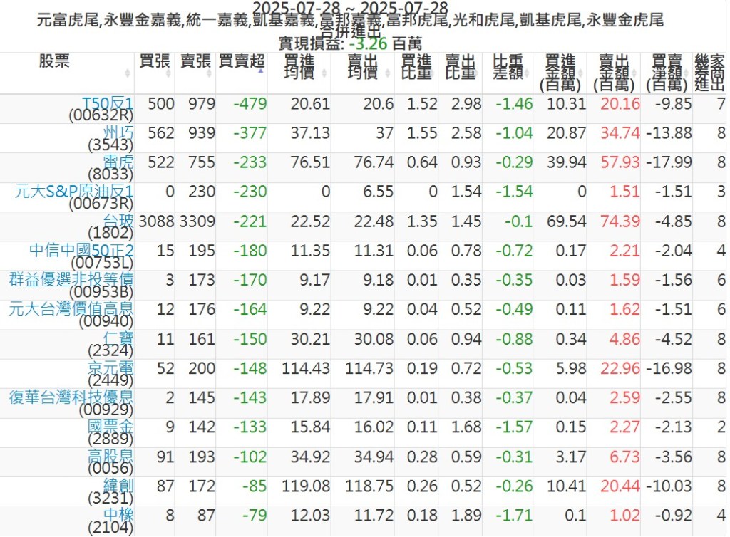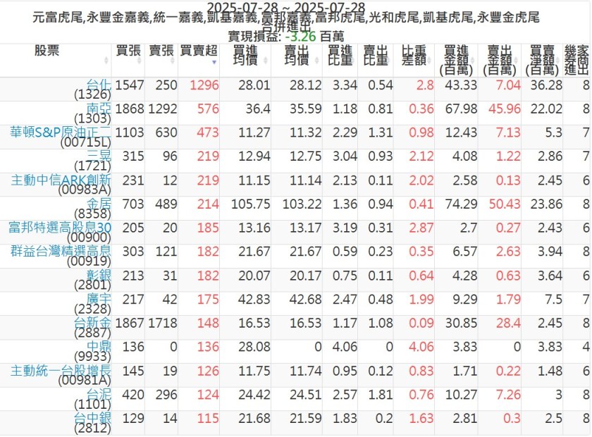 2025-0728主力買賣超個股 2025-07-28 股狗網小編 籌碼面每日資訊 發表留言 可參考下文 『如何查詢當沖、隔日沖分公司券商買賣』 主力當沖券商: 『元富虎尾』,『永豐金嘉義』,『統一嘉義』,『凱基嘉義』,『富邦嘉義』,『富邦虎尾』,『光和虎尾』,『凱基虎尾』,『永豐金虎尾』。 『當沖標的』 『買超股票』 『賣超股票』 免責宣言 本網站文章所提供資訊僅供參考,並無任何推介買賣之意,投資人應自行承擔交易風險。 分享此文: 按一下即可分享至 X(在新視窗中開啟) X 按一下以分享至 Facebook(在新視窗中開啟) Facebook 喜歡 正在載入...
