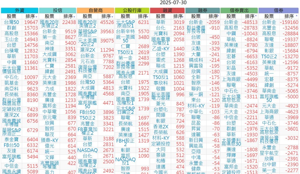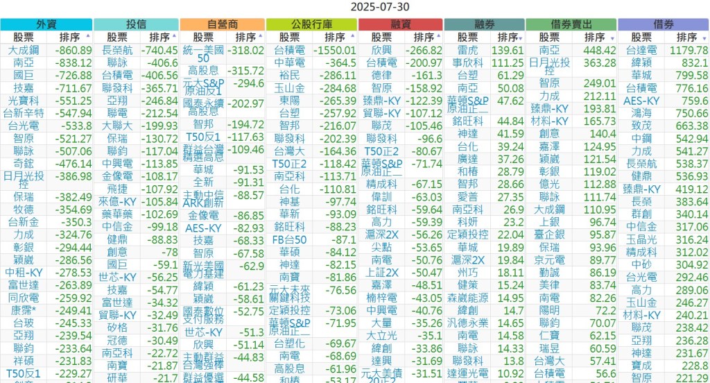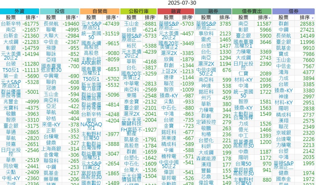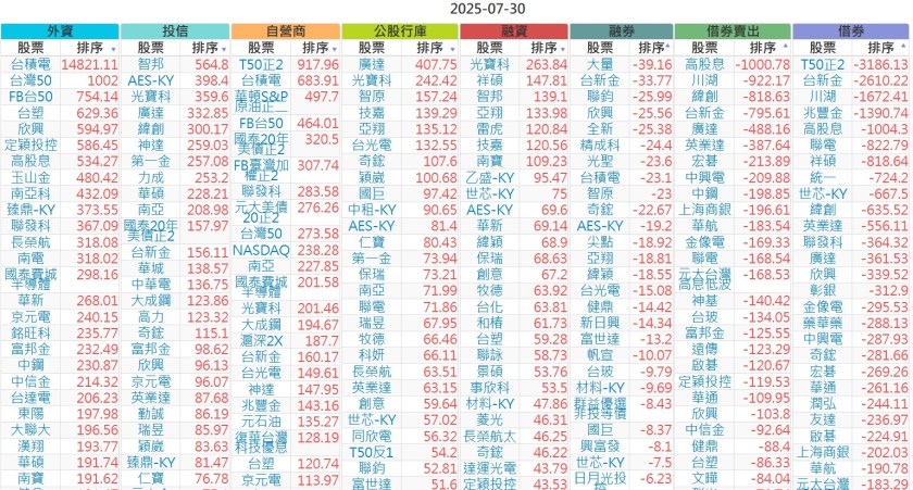 2025-0730【外資、投信】買賣超個股 2025-07-30 股狗網小編 投資誌-大盤 發表留言 上市:【外資、投信】買超(依金額) (單位:百萬) 上市:【外資、投信】賣超(依金額) (單位:百萬) 上市:【外資、投信】買超(依張數) (單位:張數) 上市:【外資、投信】賣超(依張數) (單位:張數) 免責宣言 本網站文章所提供資訊僅供參考,並無任何推介買賣之意,投資人應自行承擔交易風險。 分享此文: 按一下即可分享至 X(在新視窗中開啟) X 按一下以分享至 Facebook(在新視窗中開啟) Facebook 喜歡 正在載入...