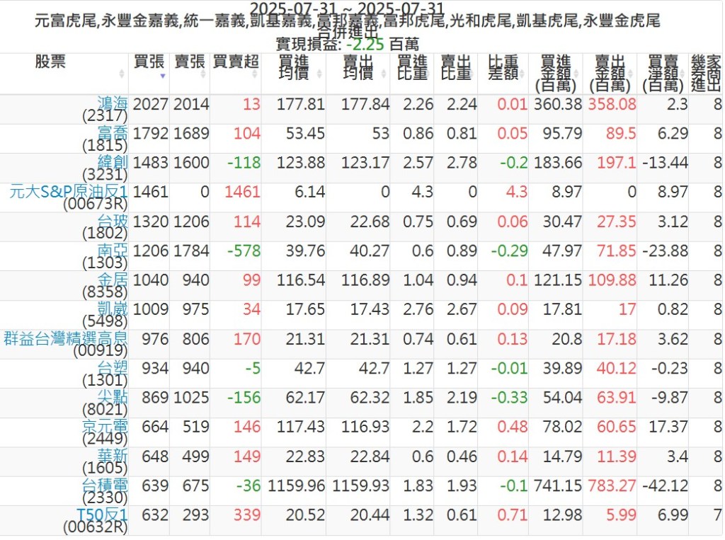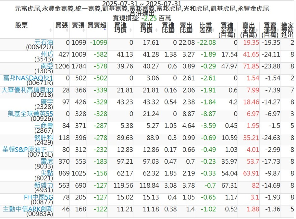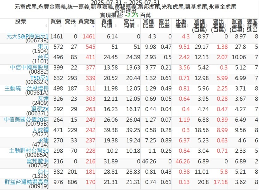 2025-0731主力買賣超個股 2025-07-31 股狗網小編 籌碼面每日資訊 發表留言 可參考下文 『如何查詢當沖、隔日沖分公司券商買賣』 主力當沖券商: 『元富虎尾』,『永豐金嘉義』,『統一嘉義』,『凱基嘉義』,『富邦嘉義』,『富邦虎尾』,『光和虎尾』,『凱基虎尾』,『永豐金虎尾』。 『當沖標的』 『買超股票』 『賣超股票』 免責宣言 本網站文章所提供資訊僅供參考,並無任何推介買賣之意,投資人應自行承擔交易風險。 分享此文: 按一下即可分享至 X(在新視窗中開啟) X 按一下以分享至 Facebook(在新視窗中開啟) Facebook 喜歡 正在載入...